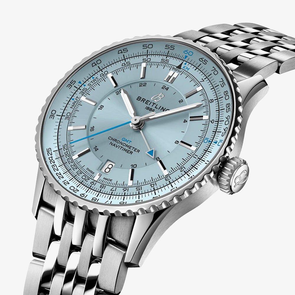 The Breitling Navitimer Automatic GMT 41 combines iconic design with contemporary refinement. Its striking blue dial features a centrally placed 24-hour scale, ensuring the intricate slide rule remains the focal point while maintaining a clean, streamlined aesthetic. A notched bezel introduces a modern touch, while alternating polished and brushed finishes create a dynamic play of light across the 41 mm stainless steel case. A sophisticated take on a legendary pilot’s watch, it balances functionality with effortless style.
