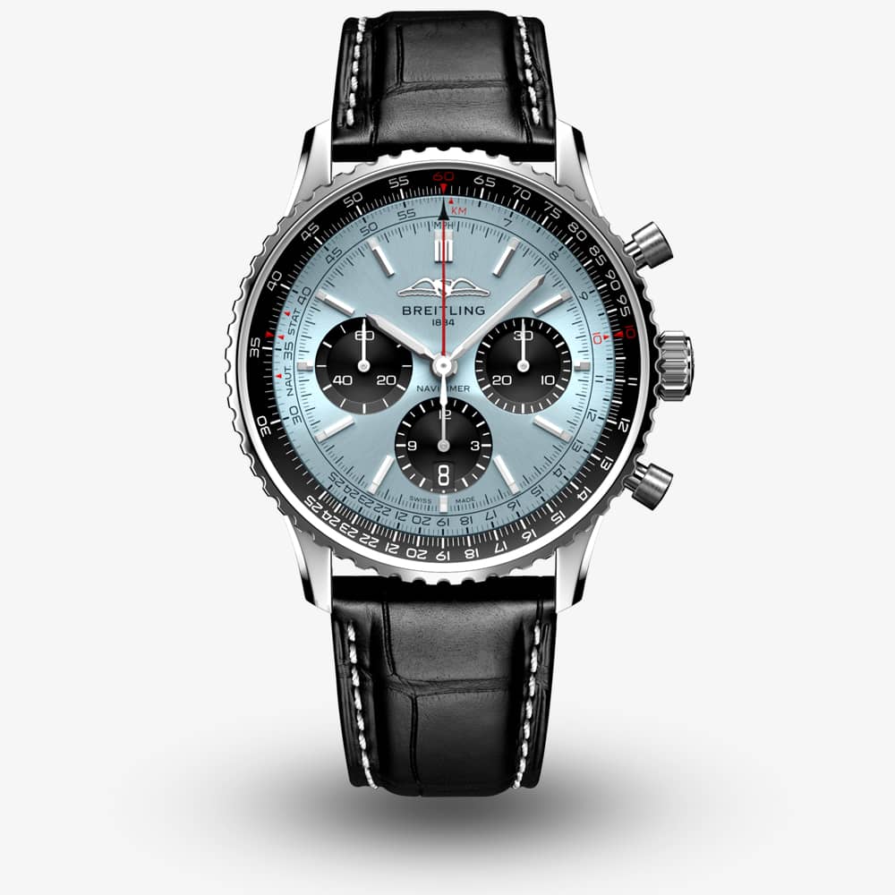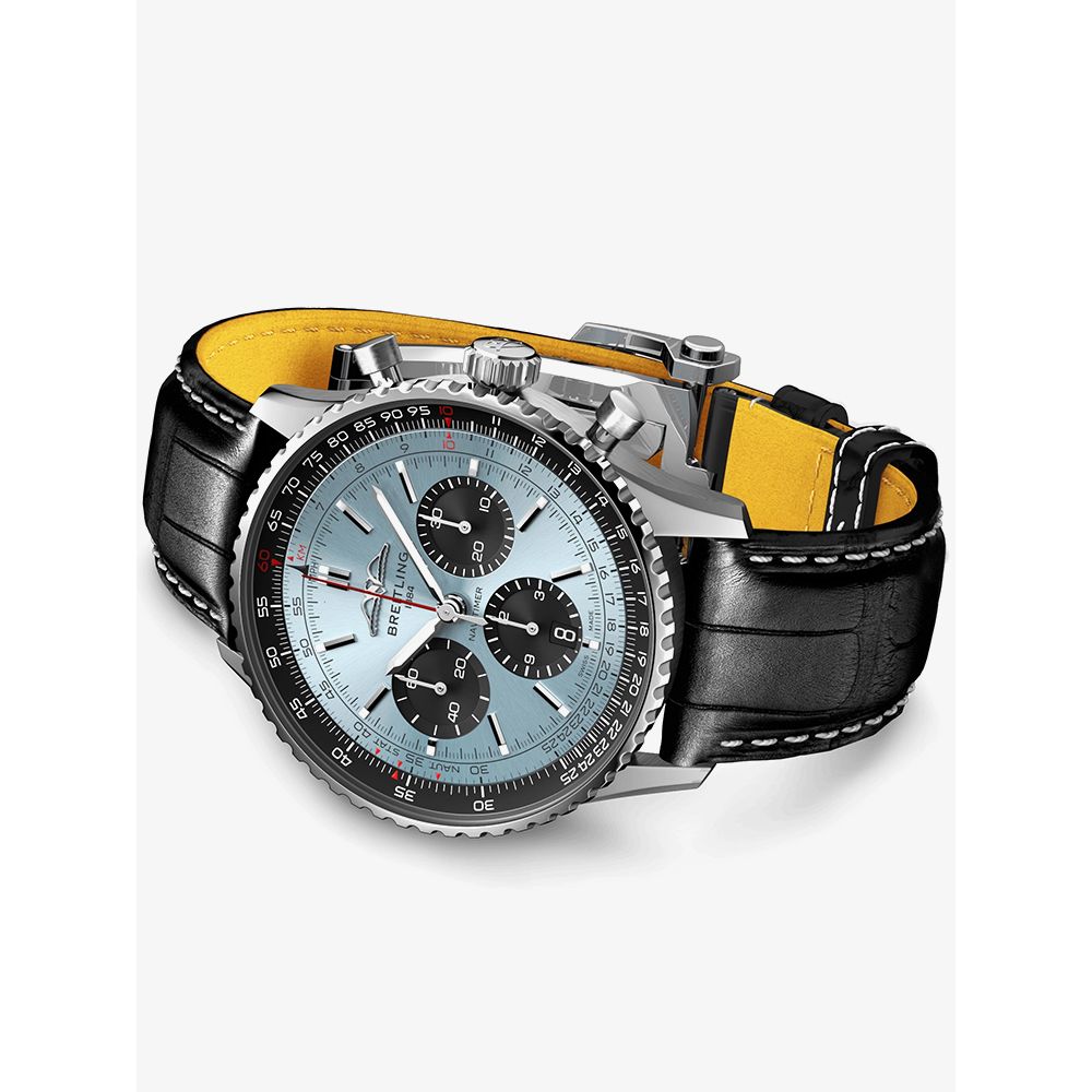 Breitling Mens Navitimer Blue Dial Chronograph Watch AB0138241C1P1 watch combines a 46mm round shaped Stainless-steel case and black leather strap with a push button deployment clasp. It has a silver analogue dial which is protected beneath sapphire crystal glass. Power is generated by the automatic movement. This model also has a water resistance of up to 30 metres.