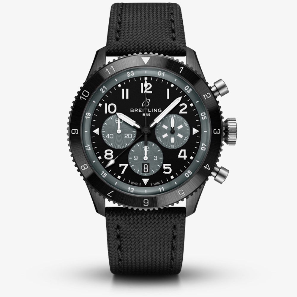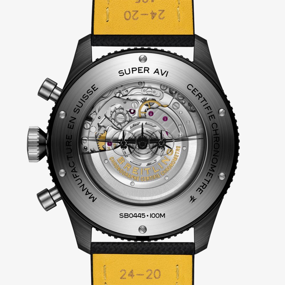 Introducing the Mens Super AVI B04 Chronograph GMT 46 Mosquito Night Fighter Watch from Breitling. This Special edition of the watch is inspired by the mosquito night fighter. At a time where aluminium and steel shortages were common this plane was made out of a lot of wood which gave its name the “Wooden Wonder”. This watch has a case and buckle completely made of titanium that gives it a super light feel and also features an image of the plain on the sapphire crystal case back.