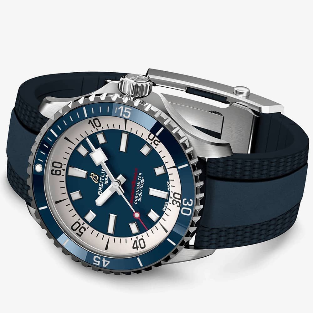 • Presented on a blue rubber strap a with push button deployment clasp.