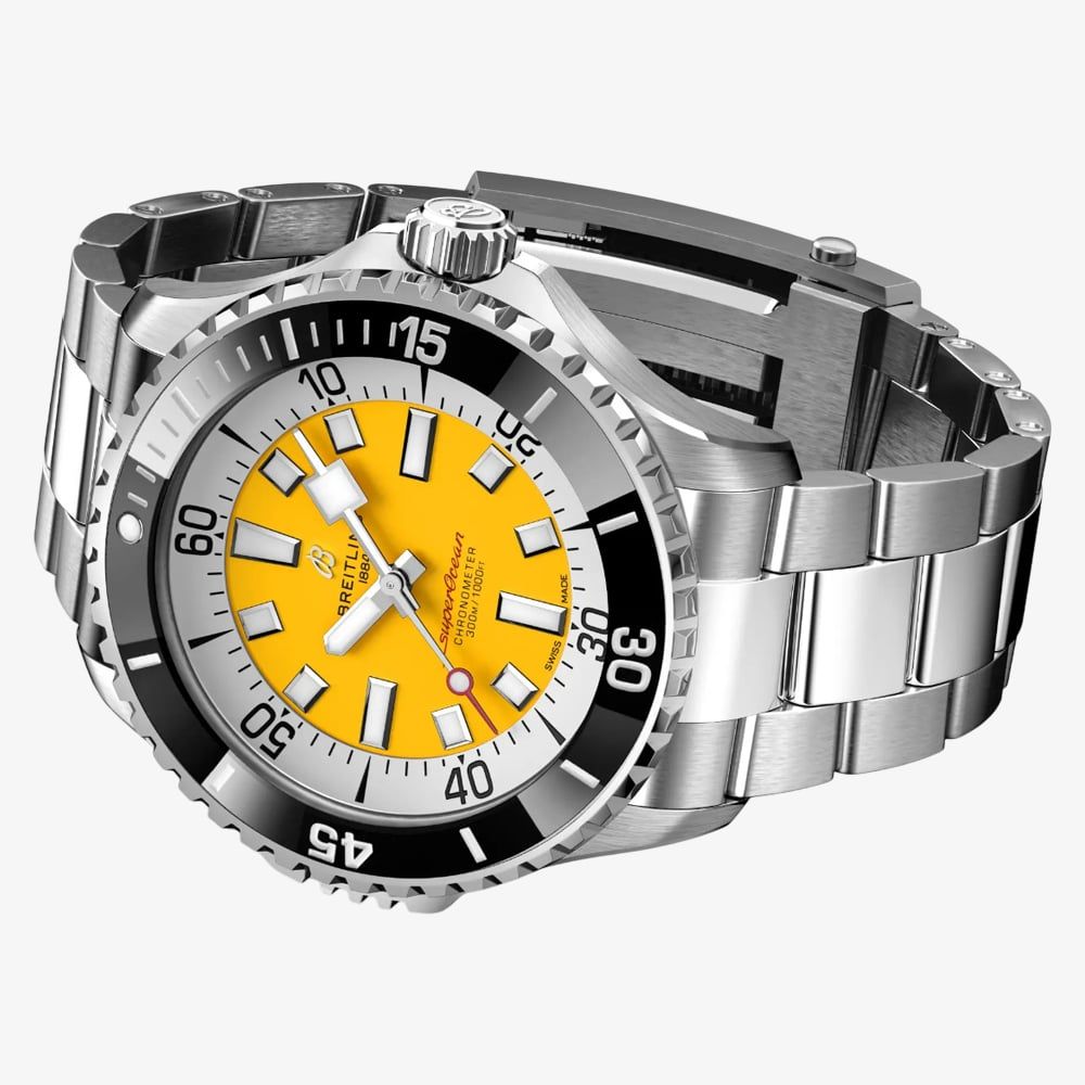 A robust and high-performance watch, the standout feature is its striking yellow dial, which enhances readability and adds a dynamic pop of colour, perfectly reflecting the adventurous spirit of the Superocean collection. Equipped with luminescent hands and hour markers, this watch ensures optimal visibility in low-light conditions, while the unidirectional ratcheted bezel allows for precise dive timing, making it an essential tool for underwater exploration.The timepiece is paired with a stainless steel bracelet, offering both comfort and durability, with a folding clasp for secure fastening. Built to withstand extreme conditions, it boasts an impressive water resistance of up to 300 meters, ensuring optimal performance in the most challenging environments.