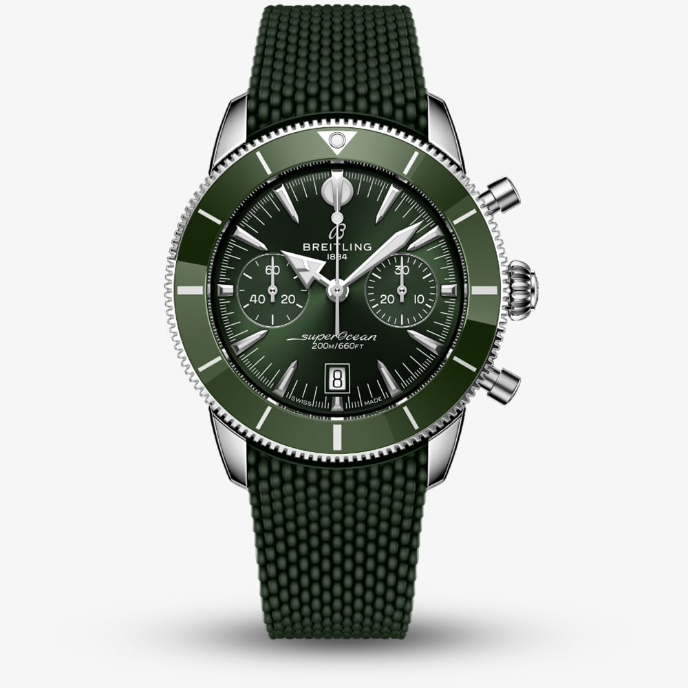 This watch features a robust 42mm stainless steel case paired with a vibrant green dial and matching green rubber strap, offering a fresh and sporty look that stands out with confidence. Its luminous silver-tone hands and hour markers ensure visibility in any light conditions, while the unidirectional ceramic bezel adds durability and diving functionality. In addition to the chronograph movement adding extra precision, this timepiece is also water resistant up to 200 metres, making it a reliable accessory for underwater exploration as well as everyday wear.