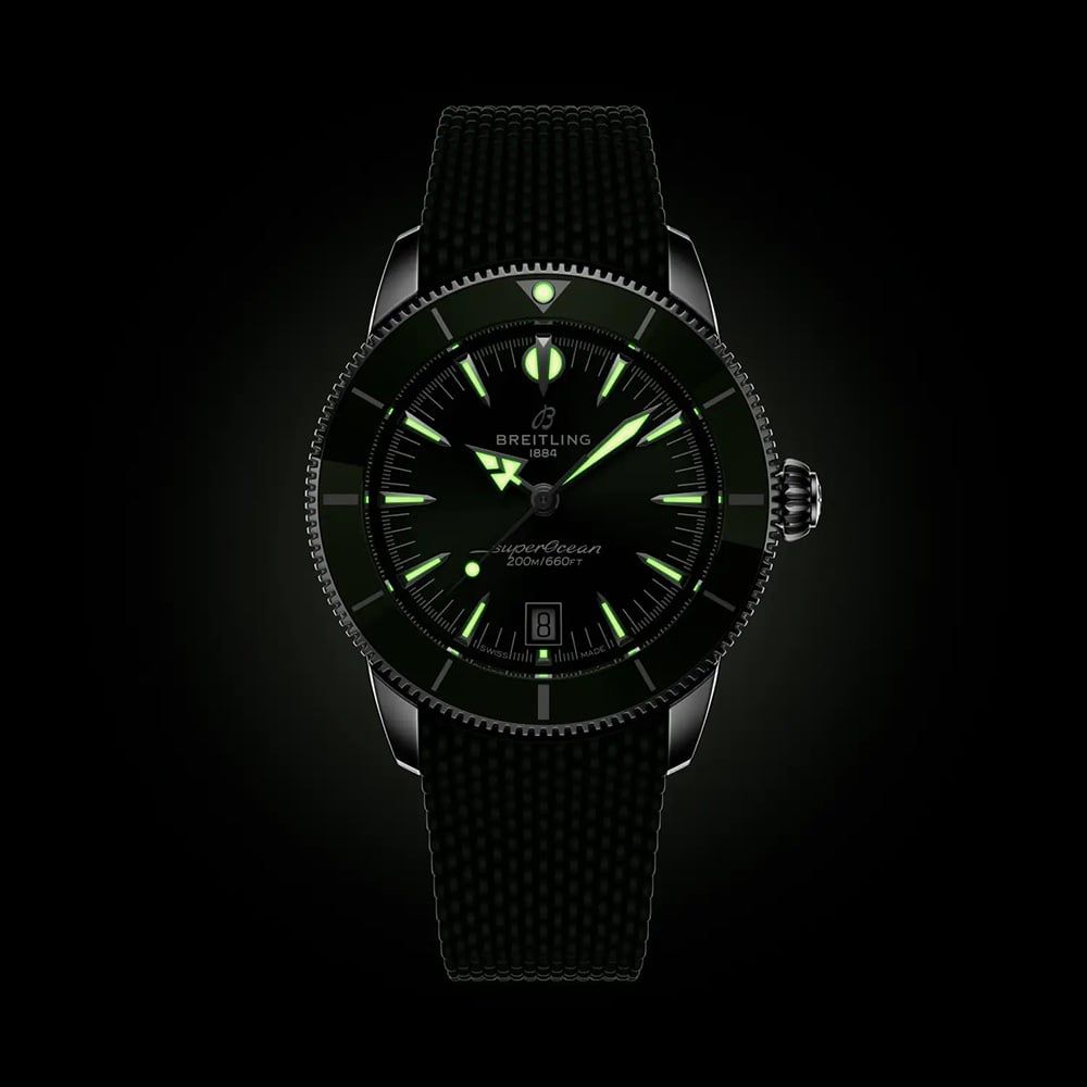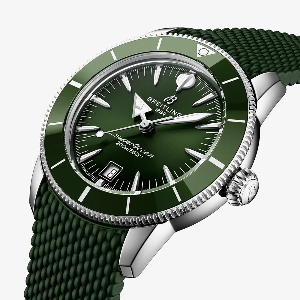 The watch features a 42mm stainless steel case paired with a deep green sunray dial that radiates energy and sophistication. Luminous hands and markers ensure excellent legibility, while the day and date window adds everyday practicality. The black rubber strap not only provides a sporty look but also ensures a secure and comfortable fit for active wear.