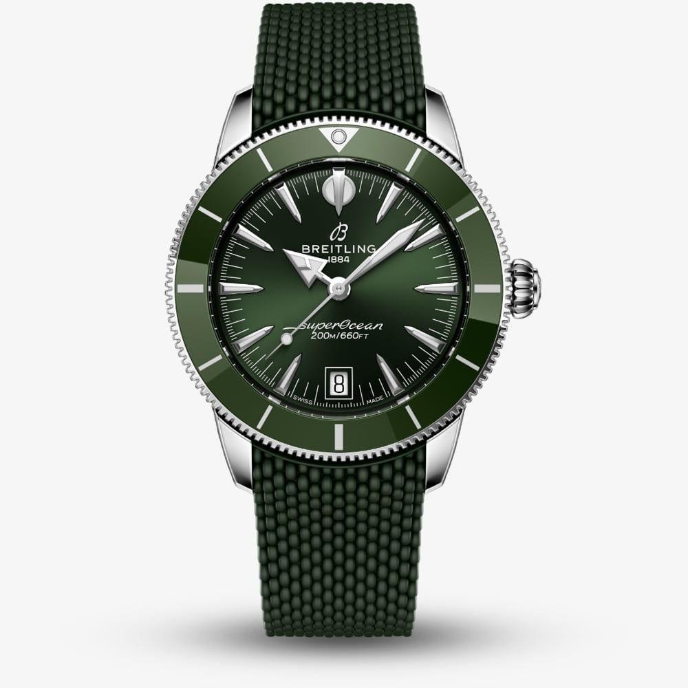 Crafted from polished stainless steel, the 44mm case houses a deep black sunray dial, creating a timeless and versatile aesthetic. Luminous hands and hour markers ensure optimal legibility, while the day and date window adds practical functionality without compromising the watch’s clean, symmetrical layout. A unidirectional green ceramic bezel adds durability and essential dive-time tracking. Complete with a sporty rubber strap for added durability and comfort.