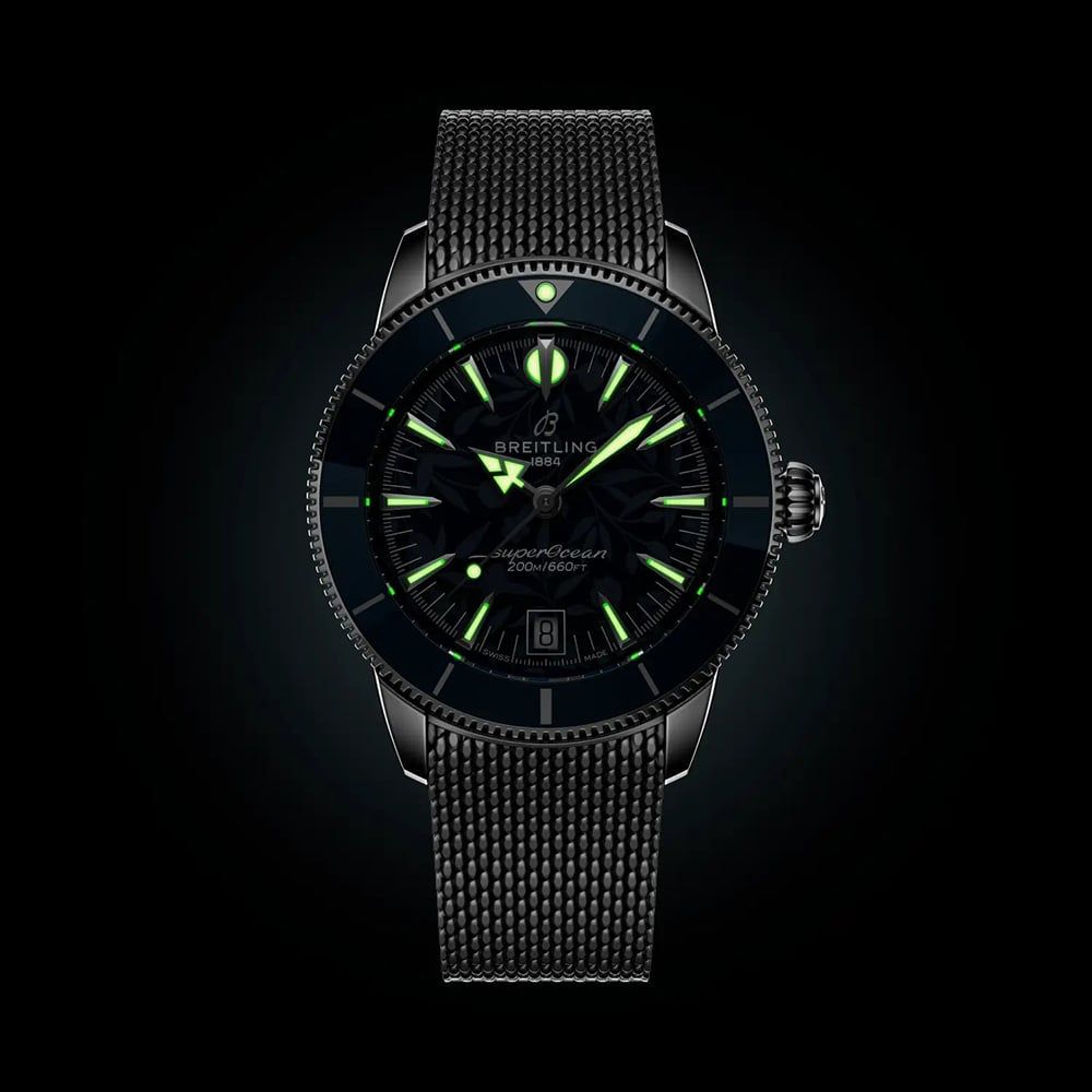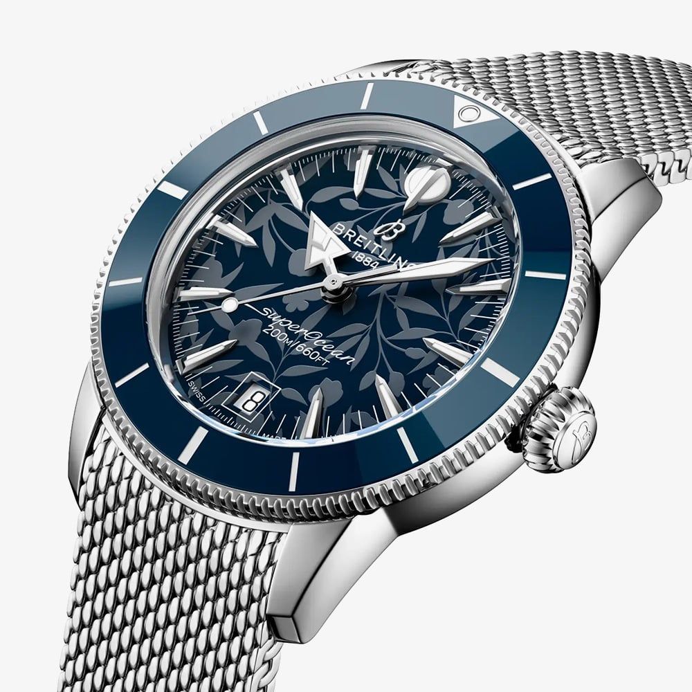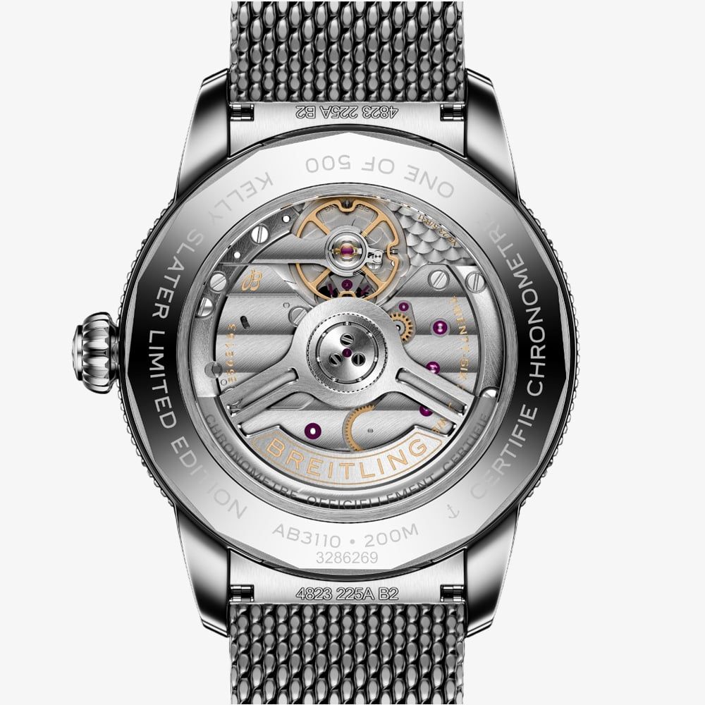 Designed in collaboration with Kelly Slater, this limited-edition timepiece fuses classic Breitling design with a bold, sporty edge that reflects Slater’s adventurous lifestyle. Housed in a robust 40mm stainless steel case, the watch features a deep blue dial inspired by the ocean. Polished silver-tone hands and luminous hour markers offer excellent legibility, while the unidirectional rotating bezel adds both style and function. Paired with a matching stainless steel mesh bracelet, the timepiece blends rugged durability with refined sophistication.