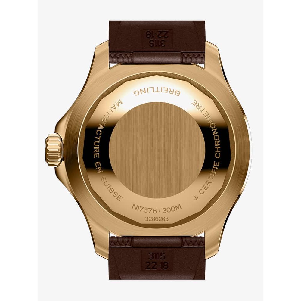 The Breitling N17376201Q1S1 watch combines a 42mm round shaped stainless-steel case and brown rubber strap with a fold over clasp. It has a brown analogue dial with luminescent hands which is protected beneath scratch resistant sapphire crystal glass. Power is generated by the automatic movement and has a power reserve of 36 hours. This model also has a water resistance of up to 300 metres.