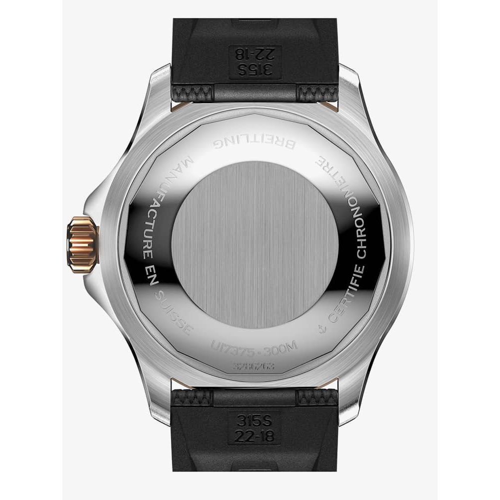 The Breitling U17375211B1S1 watch combines a 42mm round shaped stainless steel and 18ct rose gold case and black rubber strap with a push button clasp. It has a black analogue dial with luminescent hands which is protected beneath scratch resistant sapphire crystal glass. Power is generated by the automatic movement. This model also has a water resistance of up to 300 metres.