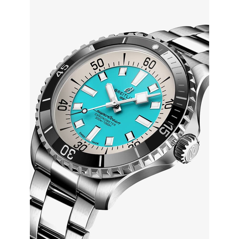 Breitling Superocean Turquois Automatic 44 Watch A17376211L2A1 combines a 44mm round-shaped stainless-steel case with a ceramic-inlay bezel and a silver stainless-steel bracelet with a push button deployment clasp. It has a turquoise analogue dial with two Super-LumiNova luminescent hands and a black tip second tracker, protected beneath cambered sapphire crystal glass, glare-proofed on both sides. Power is generated by Breitling 17 self-winding mechanical automatic movement, with a power reserve of approximately 38 hours. This model also has a water resistance of up to 300 metres.