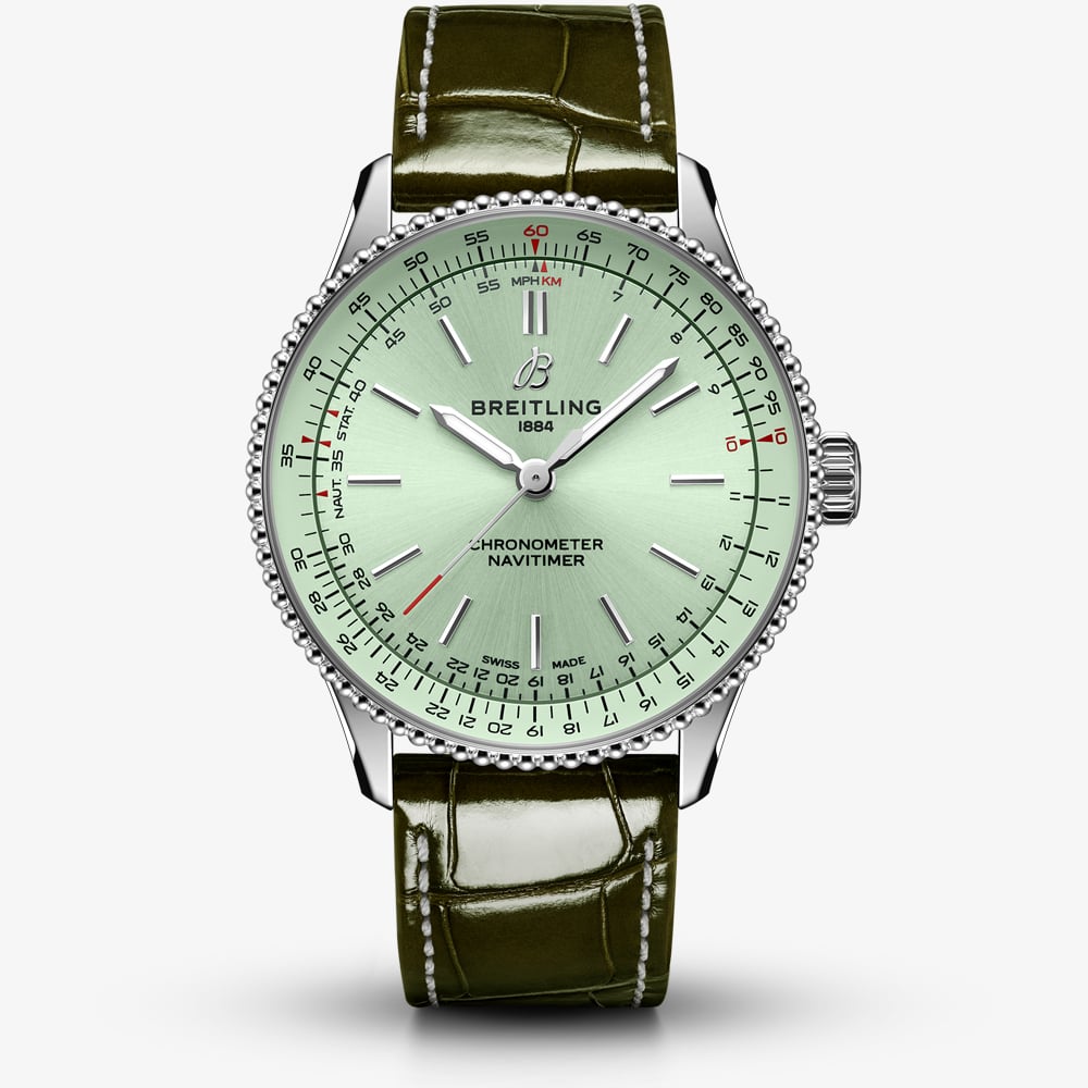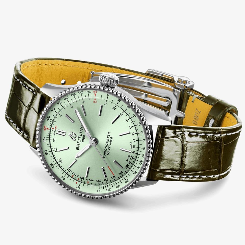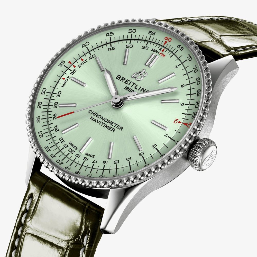 The Breitling Navitimer 36 is a stylish and functional timepiece that features a pastel green sunray dial, a beaded bezel, and an iconic circular slide rule. The dial is protected by a cambered sapphire crystal that is glare-proofed on both sides, ensuring clear visibility in all lighting conditions. The watch is powered by the Breitling Caliber 17 automatic movement, with a power reserve of 38 hours. This watch also weighs 60 grams.