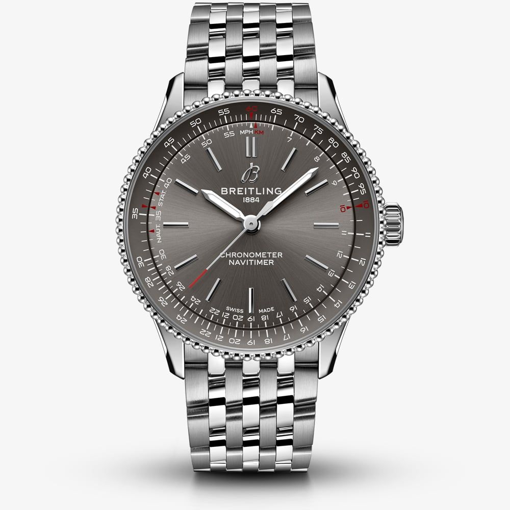 The Breitling Navitimer 36 is a stylish and functional timepiece that features a grey sunray dial, a beaded bezel, and an iconic circular slide rule. The dial is protected by a cambered sapphire crystal that is glare-proofed on both sides, ensuring clear visibility in all lighting conditions. The watch is powered by the Breitling Caliber 17 automatic movement, with a power reserve of 38 hours.
