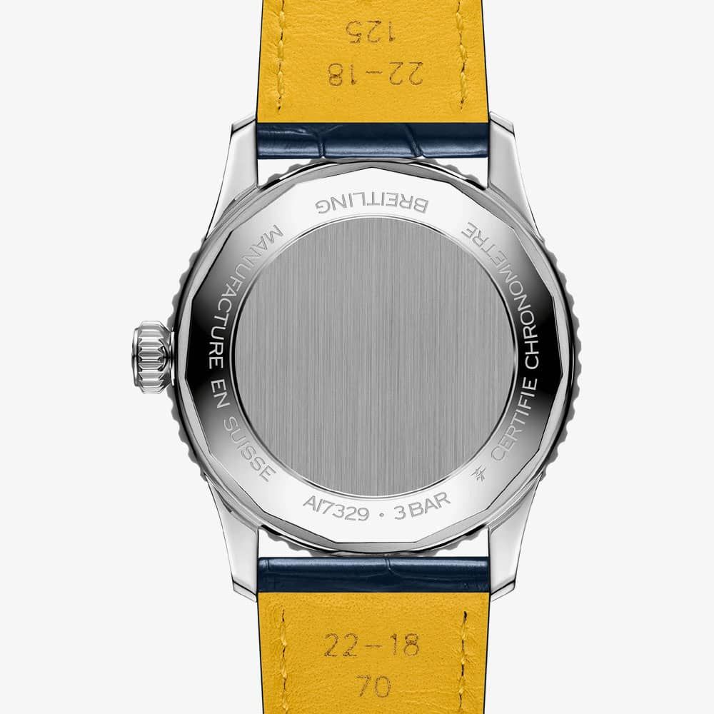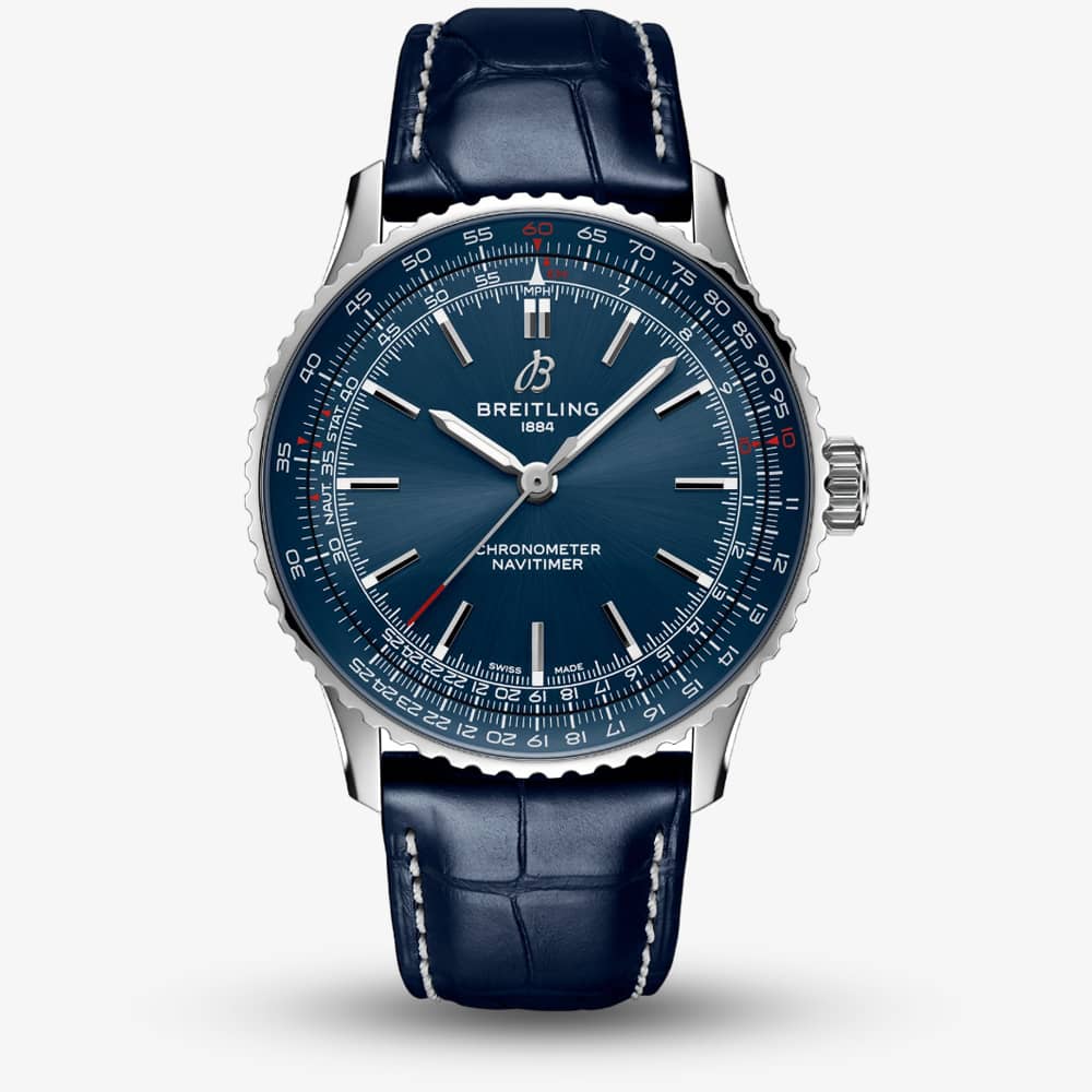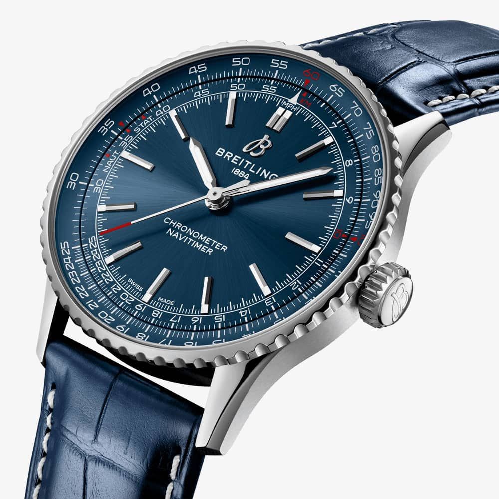 Originating in 1952 as a navigational aid for pilots, it has since transcended its utilitarian roots, holding deep personal significance for all who have worn it on their individual paths. This automatic watch is powered by a self-winding mechanical Breitling 17 calibre. This watch features a notched bezel lends a contemporary flair with a cambered sapphire glass with glareproof on both sides. , completed with a blue dial and matching blue alligator leather strap.