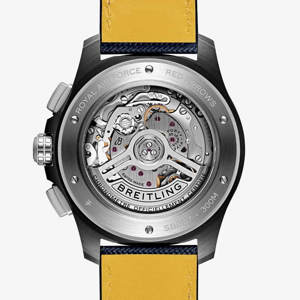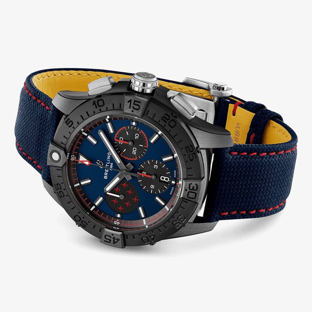 Engineered for jet pilots, the Avenger is built to withstand the most demanding cockpits and endure repeated use. This edition honours the Royal Air Force Aerobatic Team, known as the Red Arrows. However, you don’t need to be in the air force to admire its striking design, remarkable durability, and advanced features. This model boasts a blue dial featuring the Red Arrows’ Diamond Nine logo and a special engraving around the open-case back, showcasing the Breitling Manufacture Caliber 01. The black ceramic case and titanium components are complemented by a military fabric and leather strap with contrasting topstitching. Whether you can perform a barrel roll or not, you’ll appreciate its 300 m water resistance, easy-grip functionality, and corrosion-resistant construction.