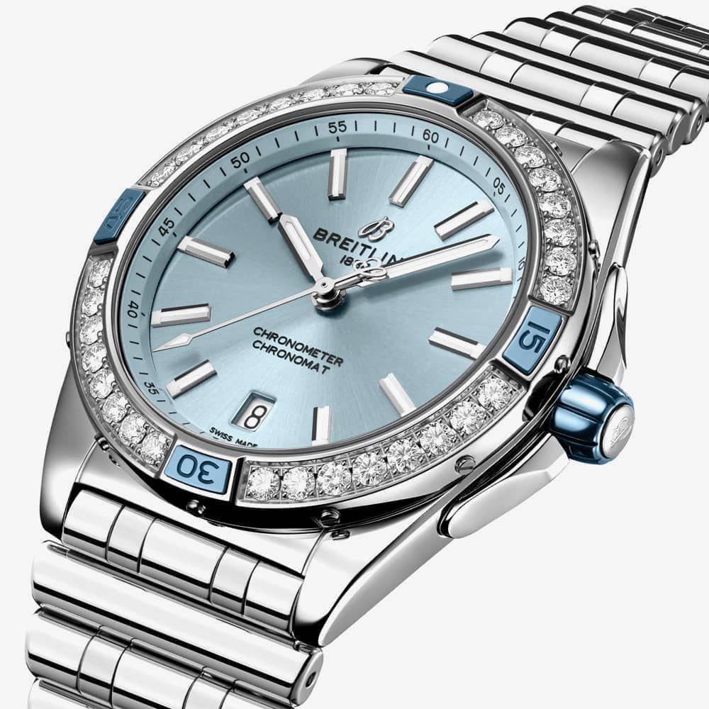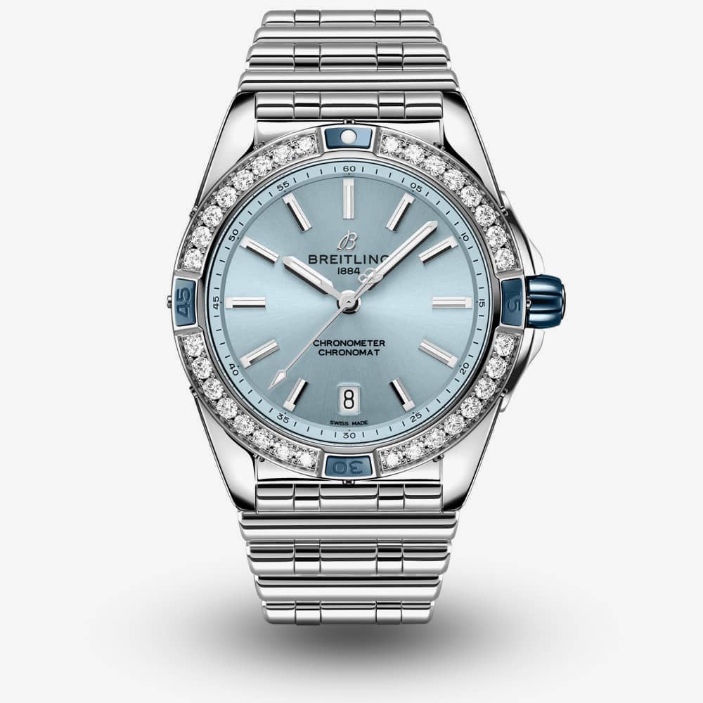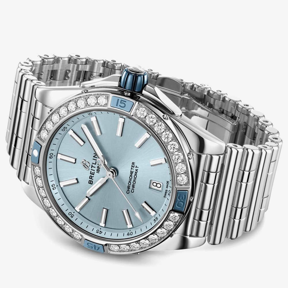 The Breitling A17356531C1A1 Chronomat watch combines a 38mm round-shaped stainless steel case with a lab grown diamond set bezel and a silver stainless steel bracelet with a push button deployment clasp. It has a light blue sunray analogue dial with luminescent hands and a date display at position six, protected beneath convex sapphire crystal, glare-proofed on both sides. Power is generated by the Breitling 17 automatic movement and has an approximate power reserve of 38 hours. This model also has a water resistance of up to 100 metres.