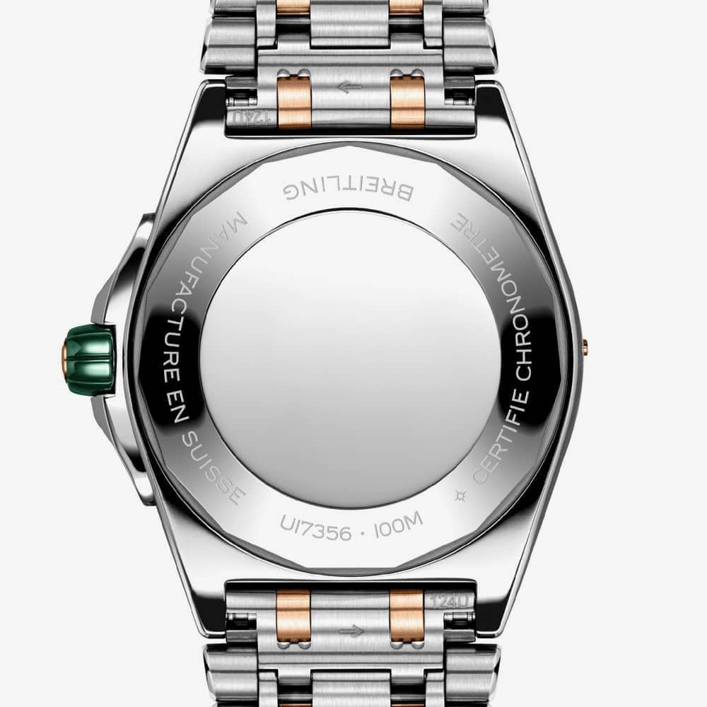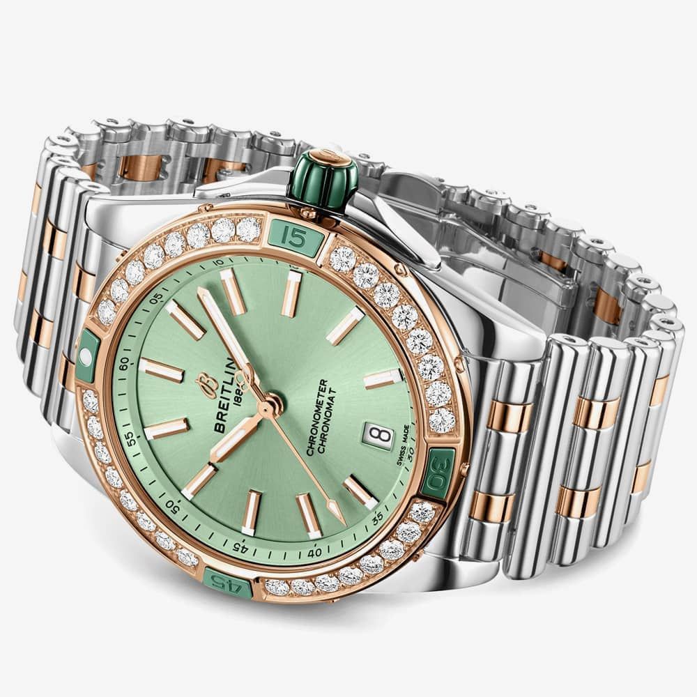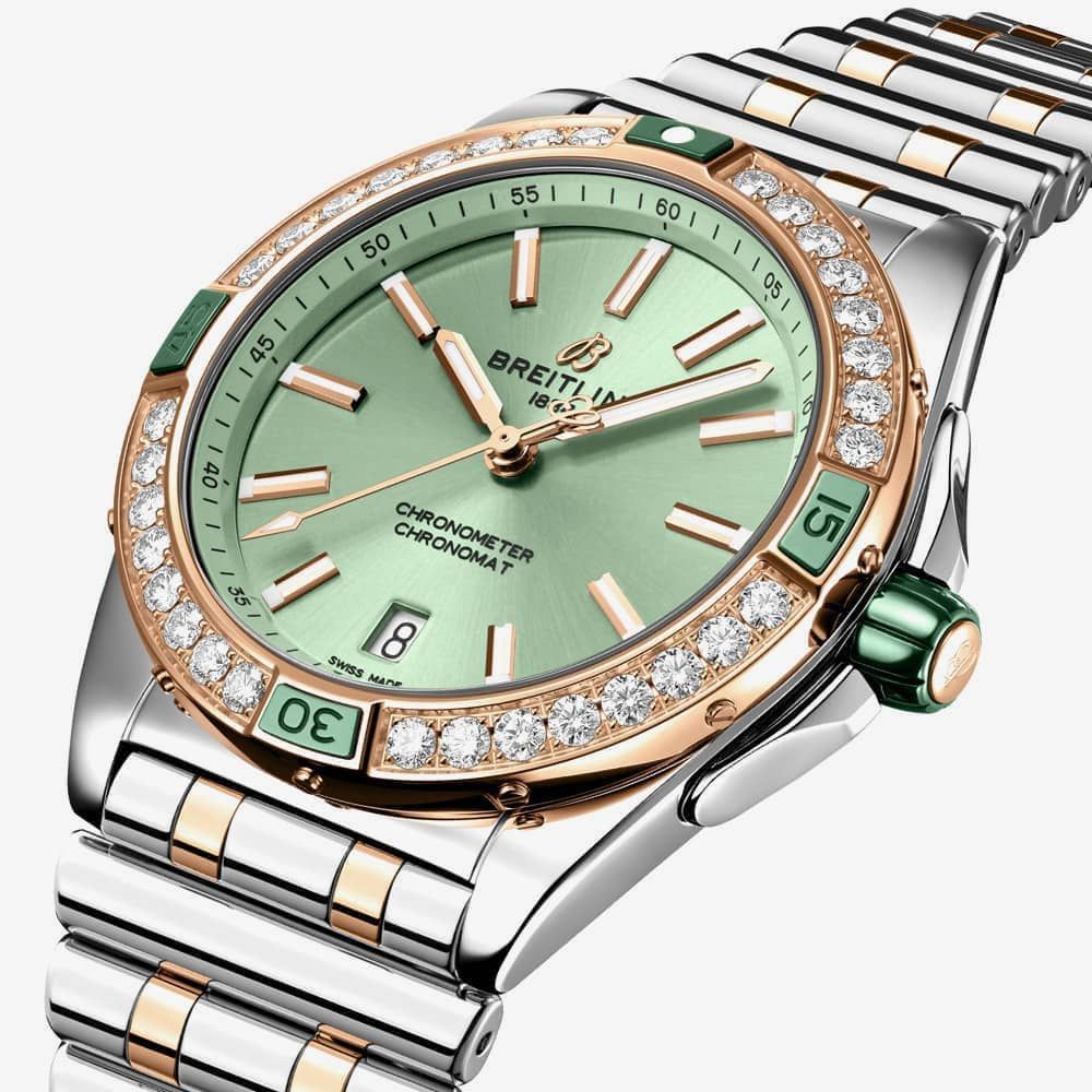 The Breitling U17356531L1U1 Chronomat watch combines a 38mm round-shaped stainless steel case with an 18ct rose gold bezel complete with lab grown diamonds, and a two-colour stainless steel bracelet with a push button deployment clasp. It has a light green sunray analogue dial with 18ct rose gold luminescent hands and a date display at position six, protected beneath scratch-resistant convex sapphire crystal glare-proofed on both sides. Power is generated by the Breitling 17 self-winding automatic movement and has a power reserve of 38 hours. This model also has a water resistance of up to 100 metres.
