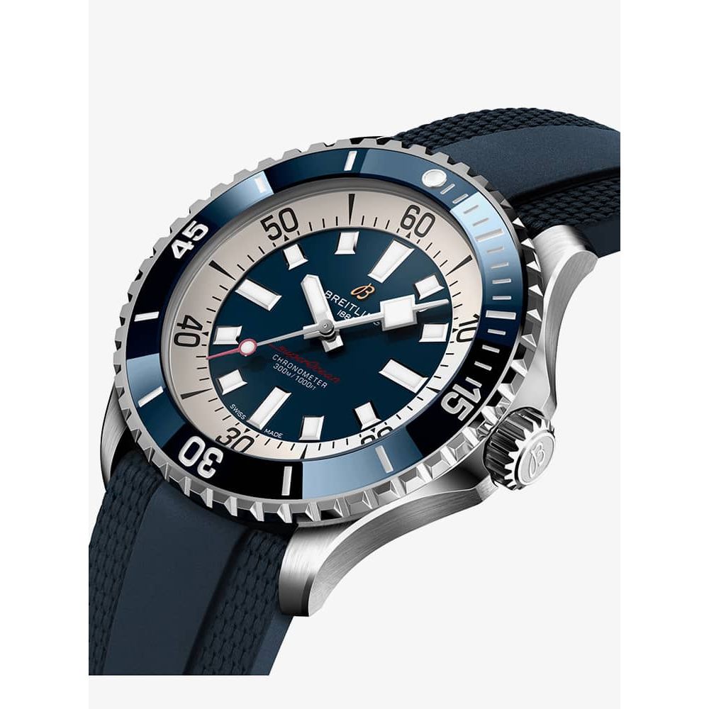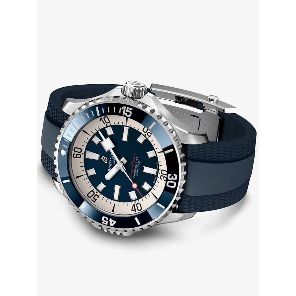 The Breitling Superocean Automatic 46mm Blue Dial A17378E71C1S1 watch combines a 46mm round shaped stainless steel case and black rubber strap with a traditional buckle. It has a blue analogue dial with Super-LumiNova coated hands which is protected beneath anti-reflective coated scratch resistant sapphire crystal glass. Power is generated by the automatic movement with a 38 hour power reserve. Watch is also shock, sand and saltwater-resistant. This model also has a water resistance of up to 300 metres.