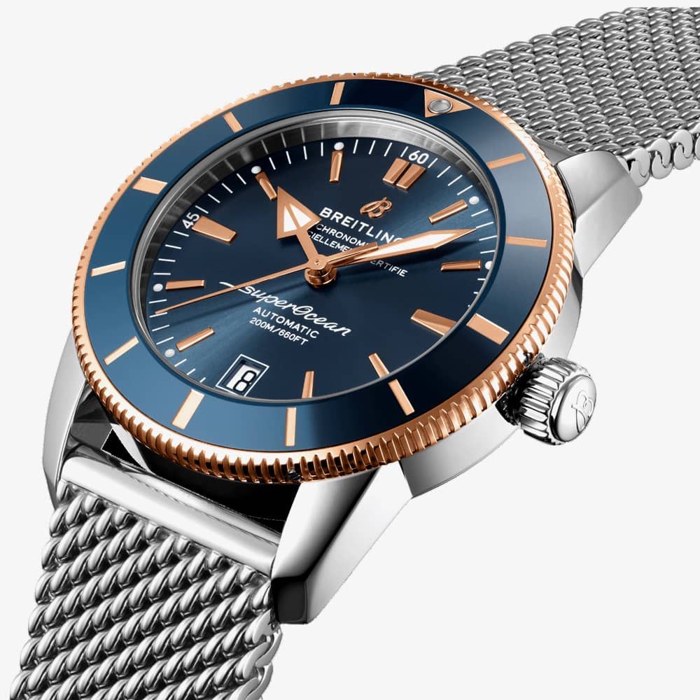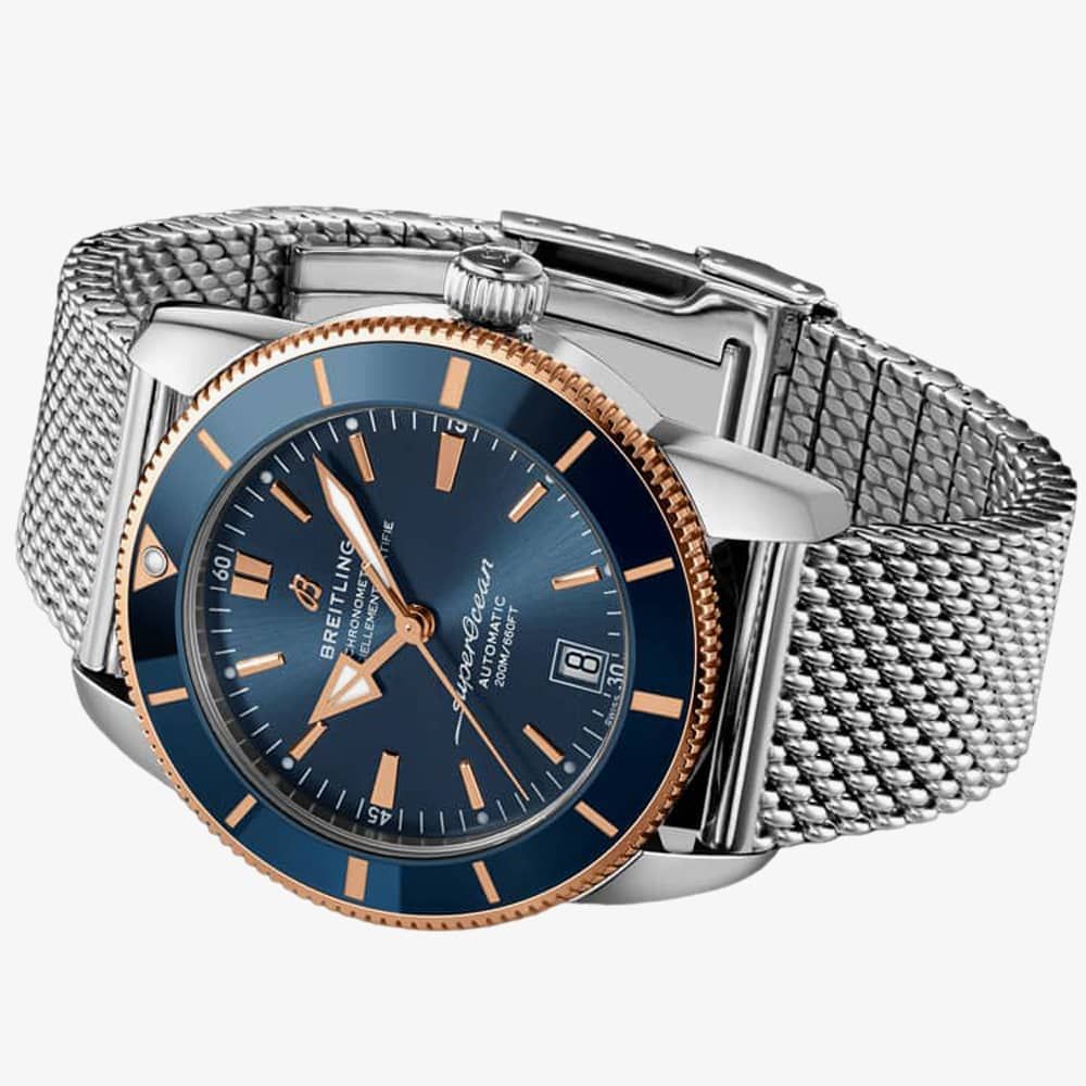 https://www.thbaker.co.uk/breitling-superocean-heritage-b20-automatic-42-watch-ub2010161c1a191995Breitling Superocean Heritage B20 Automatic 42 Watch UB2010161C1A1https://www.thbaker.co.uk/media/catalog/product/2/4/24-12-478_01.jpg48406050GBPOutOfStockS/OCEAN B20 SS BW BLU DL As a tribute to the original 1957 version, this reliable and hard wearing watch features a chronometer certified automatic movement housed inside a steel and gold case. The watch is fitted with a mesh bracelet and also has a contrasting blue dial with rose tone hands and a date display, all of which is protected beneath sapphire crystal glass.