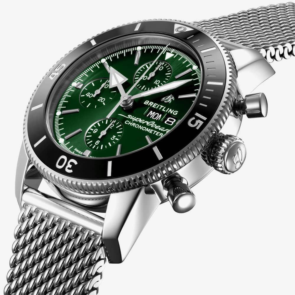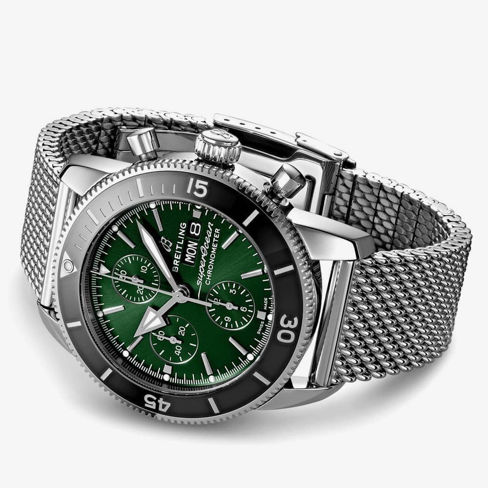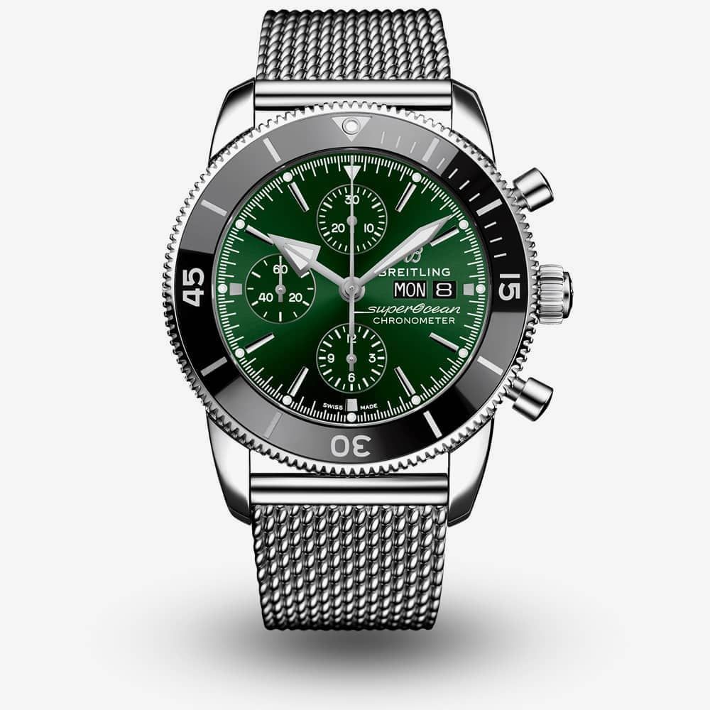 The Breitling A13313121L1A1 Superocean Heritage watch combines a 44mm round shaped stainless steel case and silver stainless steel bracelet with a fold over clasp. It has a dark green graduating analogue dial with luminescent hands, a date display and three dark green chronograph sub-dials, protected beneath scratch-resistant cambered sapphire, glare-proofed on both sides. Power is generated by the Breitling 13 self-winding automatic movement and has an approximate power reserve of 48 hours. This model also has a water resistance of up to 200 metres.