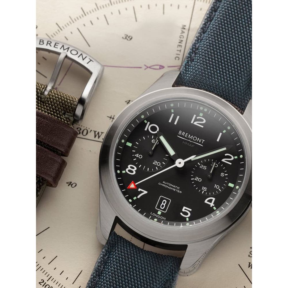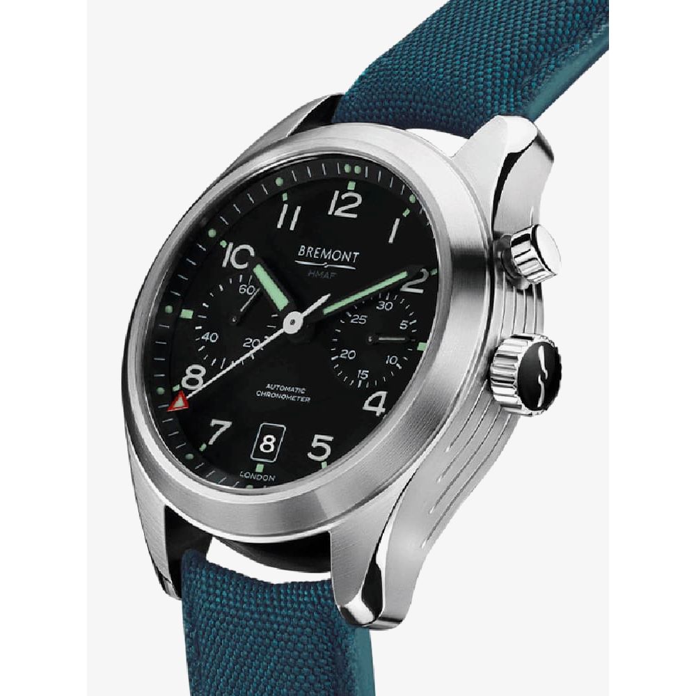 The Bremont Arrow is a modern take on the three handed 'Dirty Dozen' watch design, similar to the Broadsword but aimed at the airman with it's mono-pusher bi-compax chronograph functionality. A custom mint Super-LumiNova coating provides colour to the black dial, and the piece is finished with a 20mm RAF blue sailcloth strap.