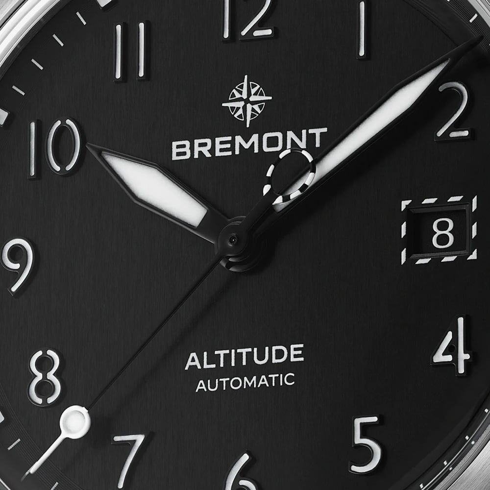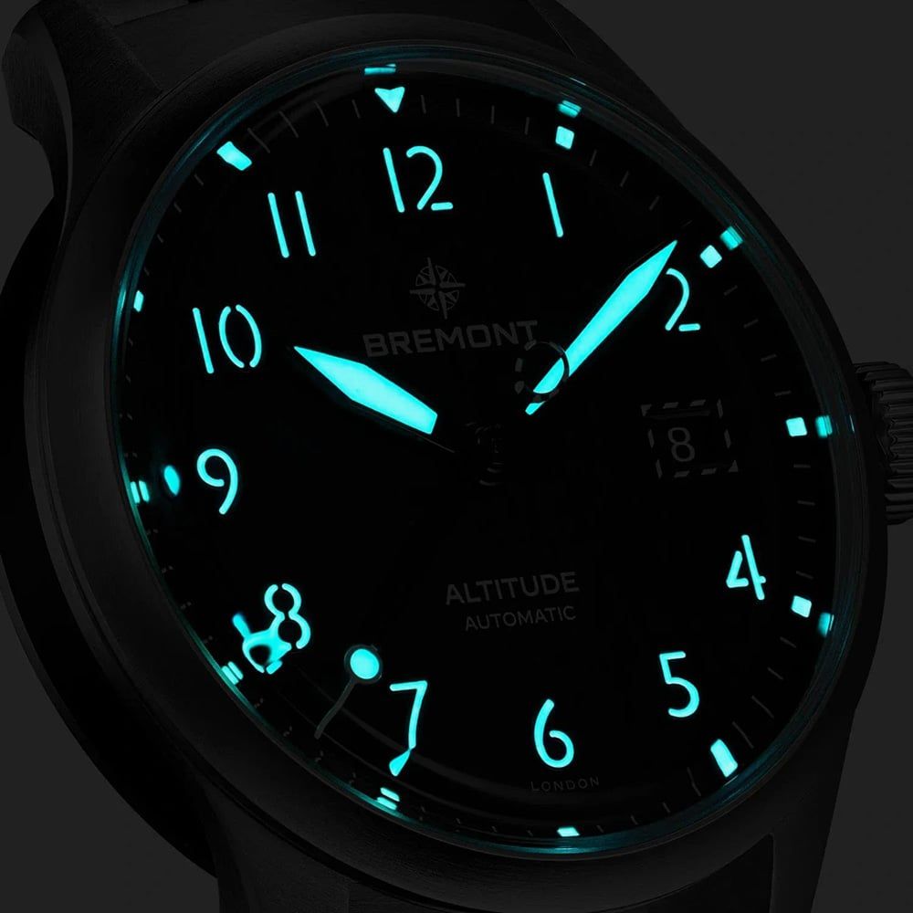 Designed for maximum legibility in any light, this timepiece features luminous markers that glow bright when visibility fades. The dial is anchored by Bremont’s signature lollipop seconds hand, counterbalanced by a striped ejection pull handle motif, a nod to the brand’s aviation roots. It’s a standout detail on a watch built for precision, style, and performance.