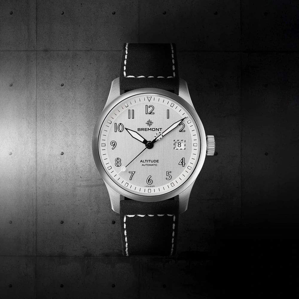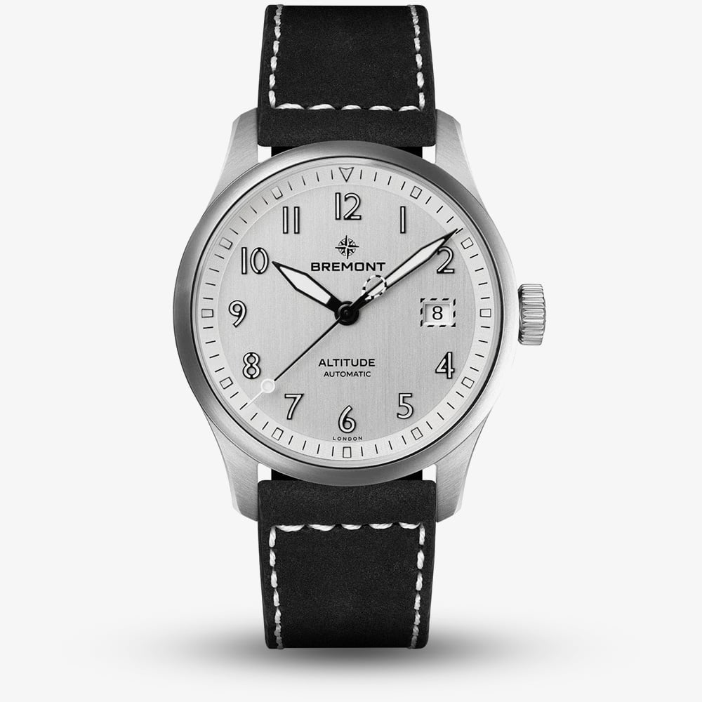 An ultra-durable take on the iconic Altitude MB watch, the Altitude 39 Date combines military-grade toughness with everyday sophistication. Its crisp silver dial pairs effortlessly with a black leather strap, while luminous markers and Bremont’s signature lollipop seconds hand. Housed in a slim 39mm stainless steel case, this timepiece is powered by a robust automatic movement with a 68-hour power reserve. Designed for resilience and legibility in all conditions, it’s the perfect blend of precision, heritage, and style, on the ground or at altitude.