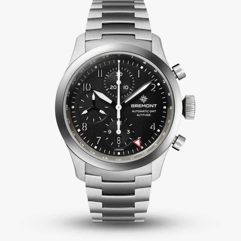 Built for high performance and global travel, this watch features a dual-time zone GMT function that keeps you connected across continents. The bold black dial offers a striking contrast against the polished stainless steel case and bracelet. Every detail is designed for clarity and impact, from the precision chronograph sub-dials to the luminous hands that shine in low light. Crafted with a hardened stainless steel case and anti-reflective sapphire crystal glass, this timepiece offers exceptional durability and readability.