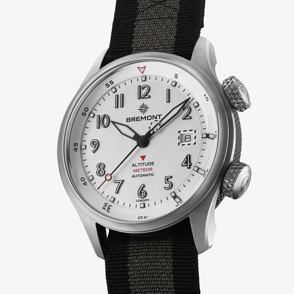The Altitude MB Meteor is the most advanced model in Bremont’s MB series, inspired by the Gloster Meteor, Britain’s first jet fighter. Its 42mm Grade 2 titanium case features a slimmer Trip-Tick design and upgraded Roto-Click inner bezel for smoother, more precise operation.