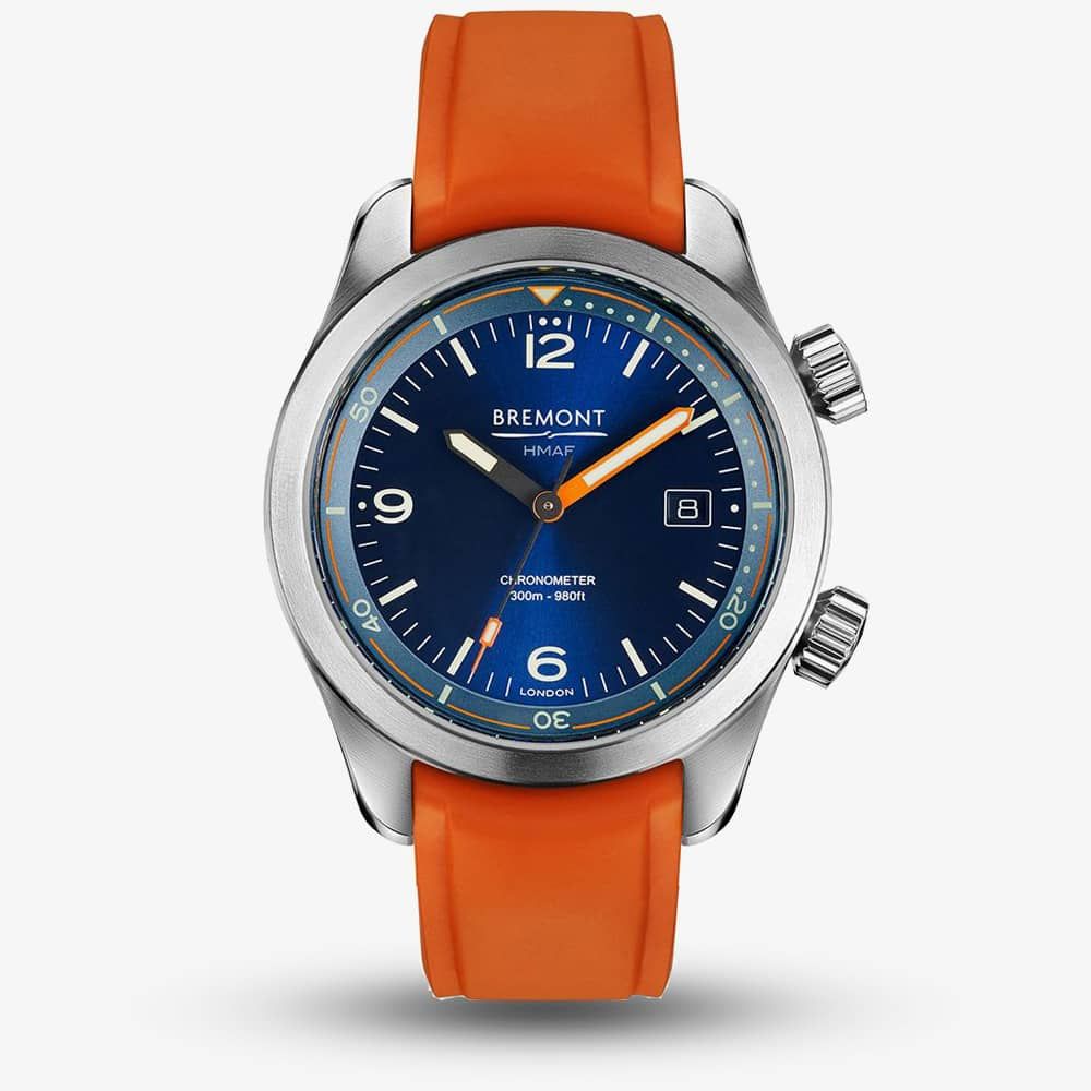 The Bremont Argonaut Azure watch combines a 42mm round shaped polished and hardened stainless steel case and orange ‘temple island’ rubber strap with a buckle clasp. It has a blue analogue dial with a ‘Dirty Dozen’ inspired layout, which also integrates SuperLuminova coated dial hands and a date display, all of is protected beneath domed scratch resistant sapphire crystal glass with an anti-reflective coating. Power is generated by the modified calibre 11 1/2’’’ BE-92AV automatic chronometer with a 42 hour power reserve. This model also has an internal rotating bezel operated by a lockable crown at 4 o’clock, and a water resistance of up to 300 metres.
