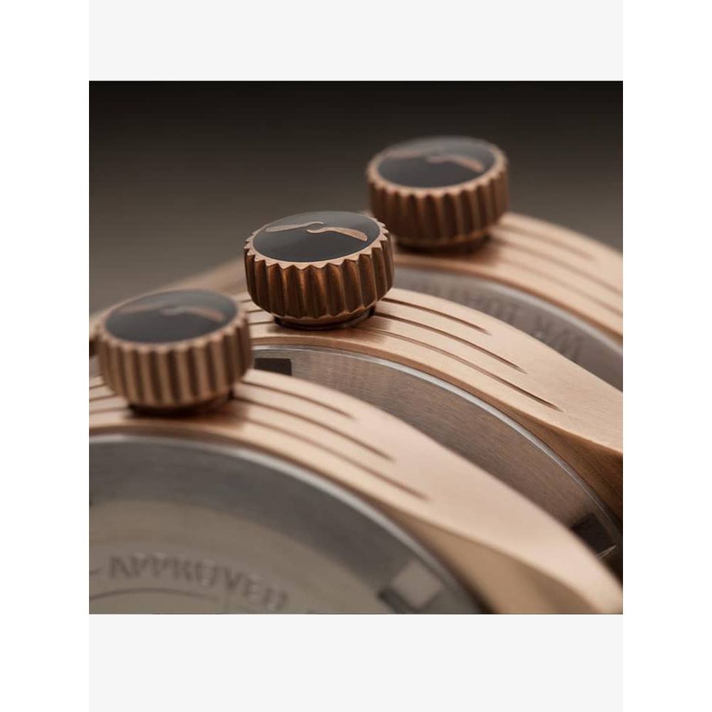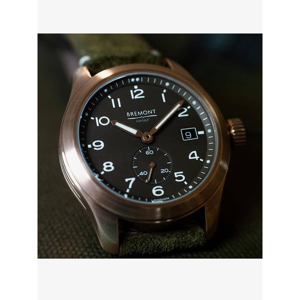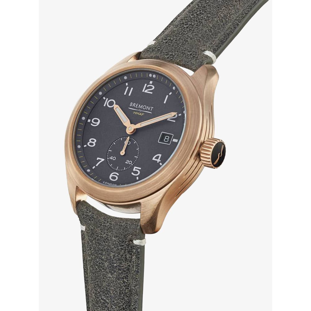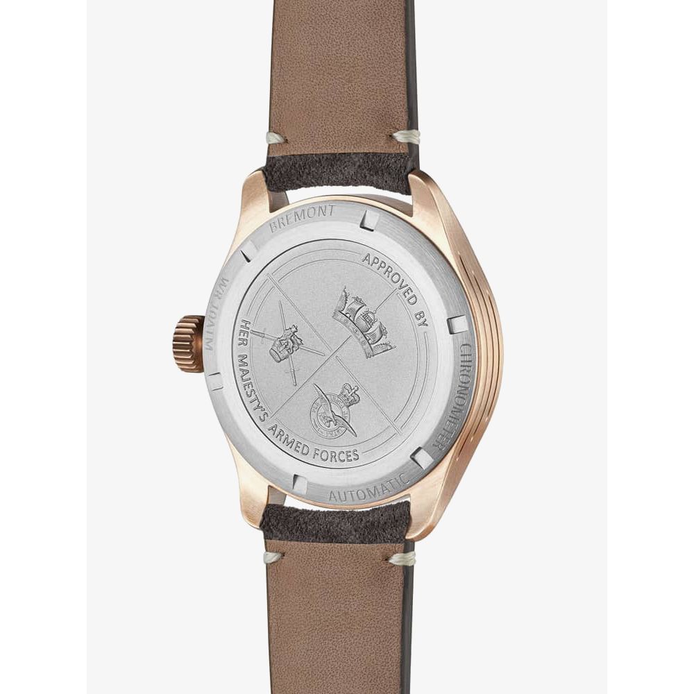 A Bremont watch from The Armed Forces Collection combining a 40mm solid CuSn8 bronze case with a 20mm nubuck strap with white stitching. Power is generated by a modified calibre 11 1/2" BE-95-2AV automatic chronometer with 31 jewels and a 38 hour power reserve. Domed anti-reflective, scratch resistant sapphire crystal protects the dial.