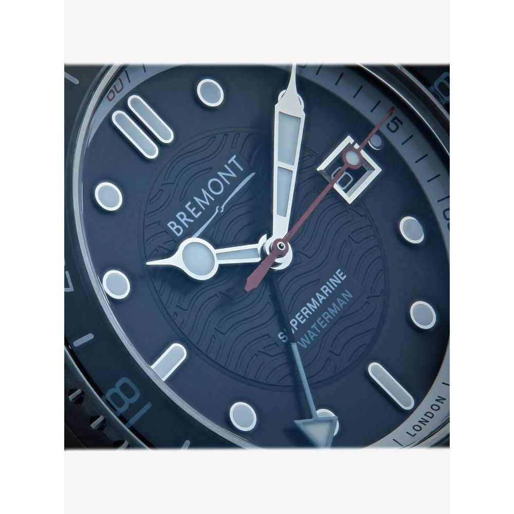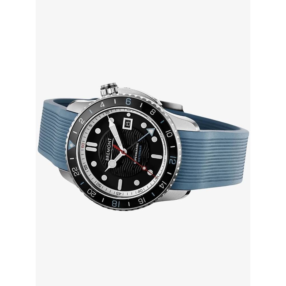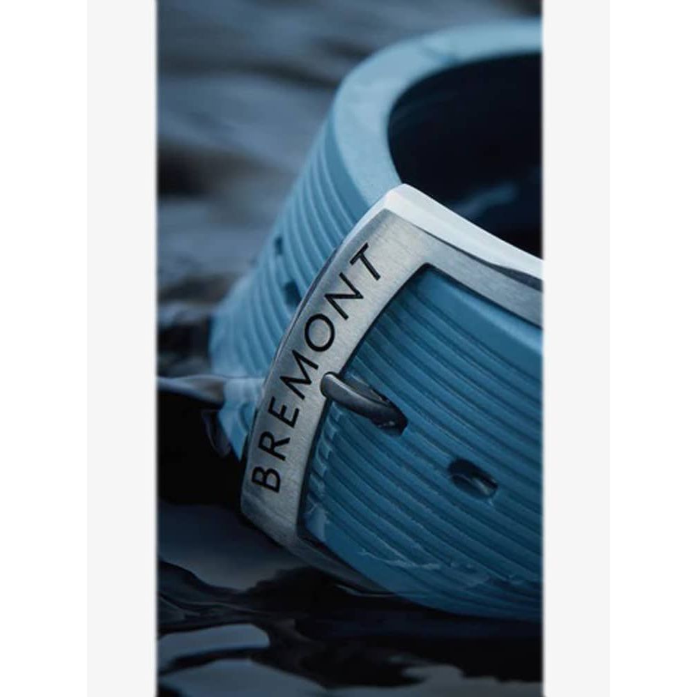 The Bremont Limited Edition Waterman Apex Watch WATERMAN-APEX-R-S combines a 43mm round-shaped stainless steel Bremont Trip-Tick case with an automatic helium escape valve and an integrated 'harbour' blue rubber strap with a traditional buckle. It has a black metal analogue dial with nickel-plated Super-LumiNova luminescent hands and a date display at position three with a white border, protected beneath domed scratch-resistant sapphire crystal glass with an anti-reflective coating. Power is generated by the self-winding automatic movement with an approximate power reserve of 42 hours. This model also has a water resistance of up to 500 metres. Limited Edition of 250 pieces.