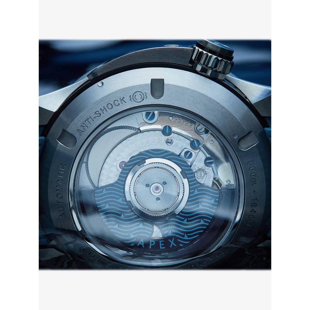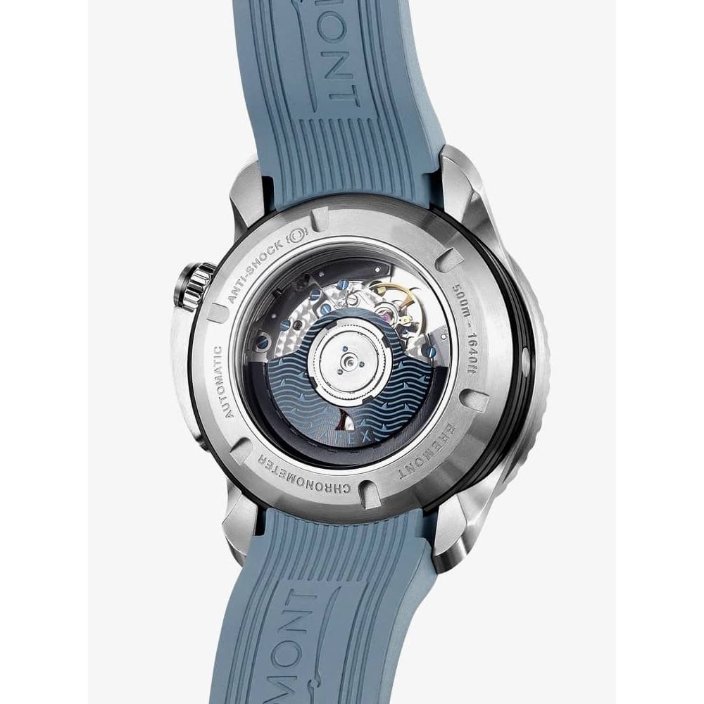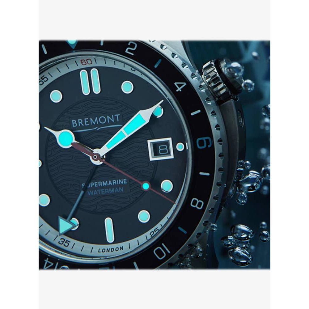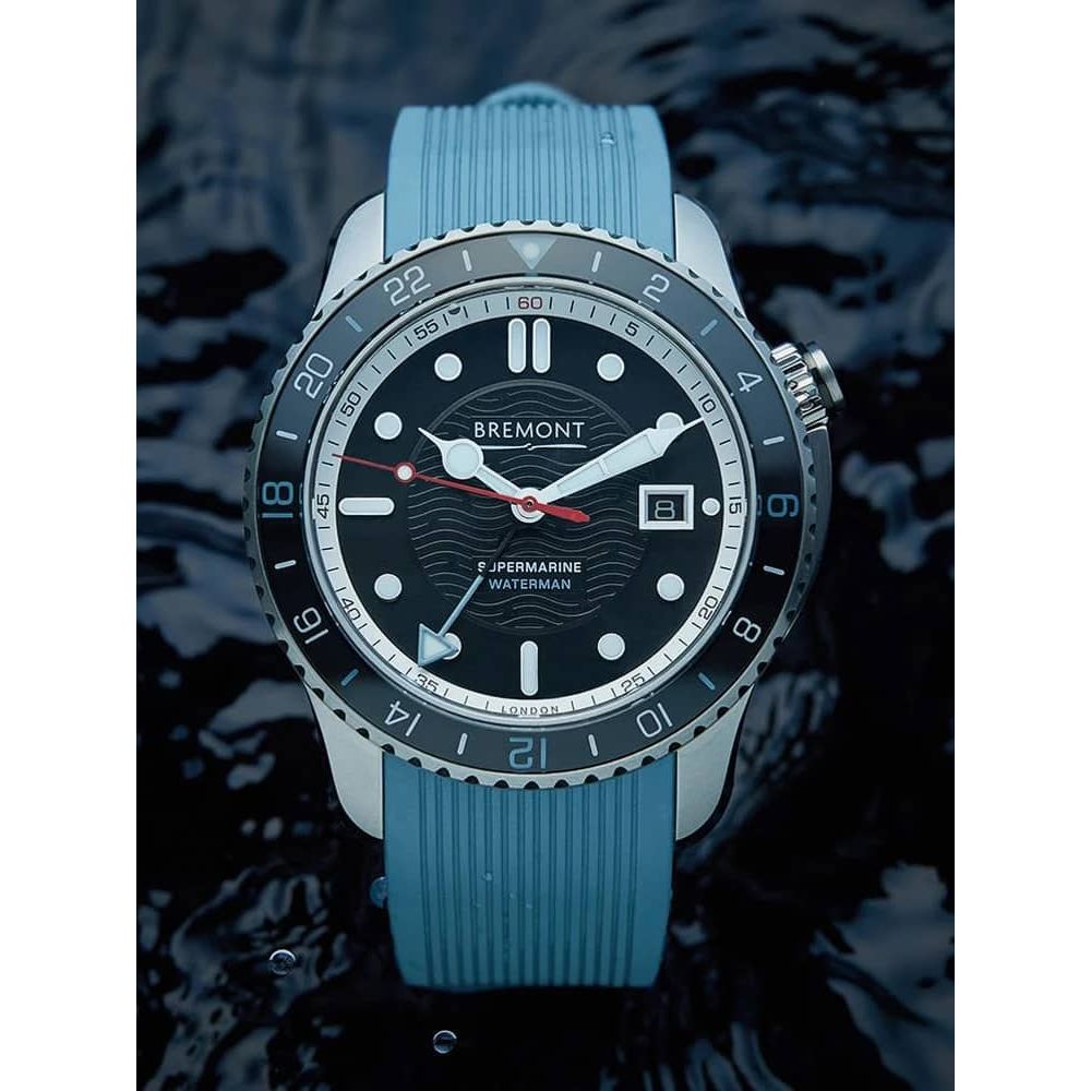 The Bremont Limited Edition Waterman Apex Watch WATERMAN-APEX-R-S combines a 43mm round-shaped stainless steel Bremont Trip-Tick case with an automatic helium escape valve and an integrated 'harbour' blue rubber strap with a traditional buckle. It has a black metal analogue dial with nickel-plated Super-LumiNova luminescent hands and a date display at position three with a white border, protected beneath domed scratch-resistant sapphire crystal glass with an anti-reflective coating. Power is generated by the self-winding automatic movement with an approximate power reserve of 42 hours. This model also has a water resistance of up to 500 metres. Limited Edition of 250 pieces.