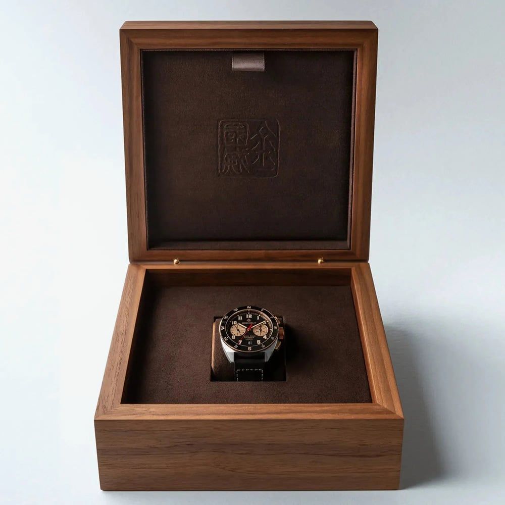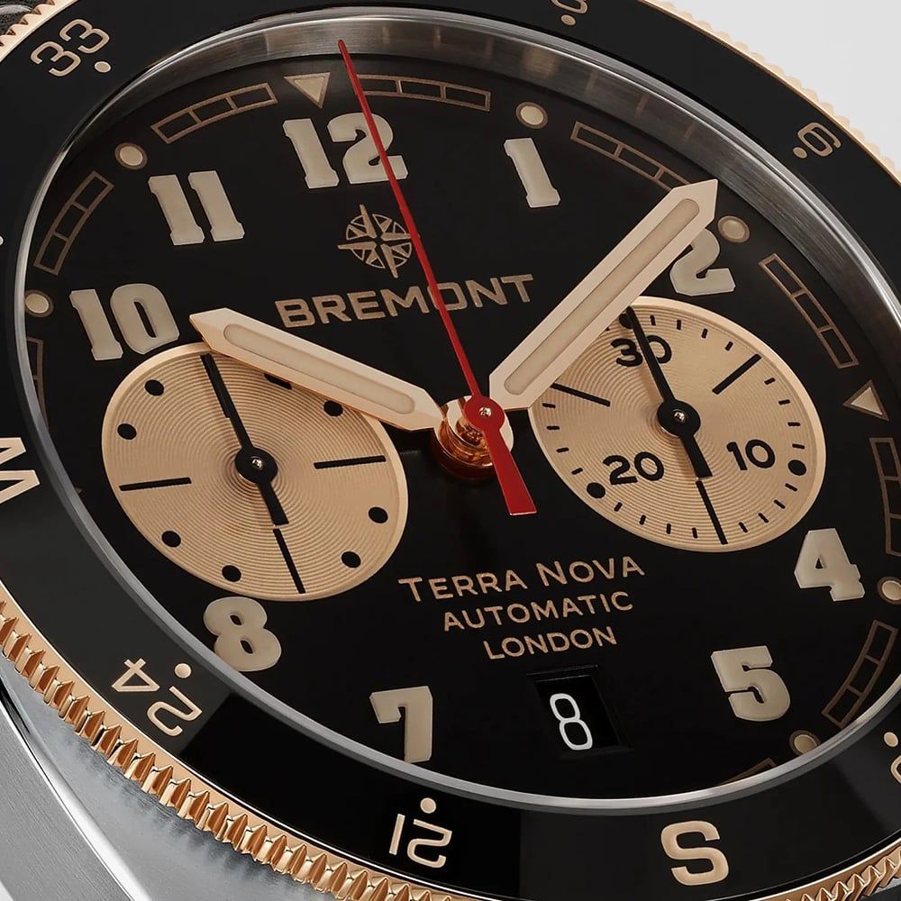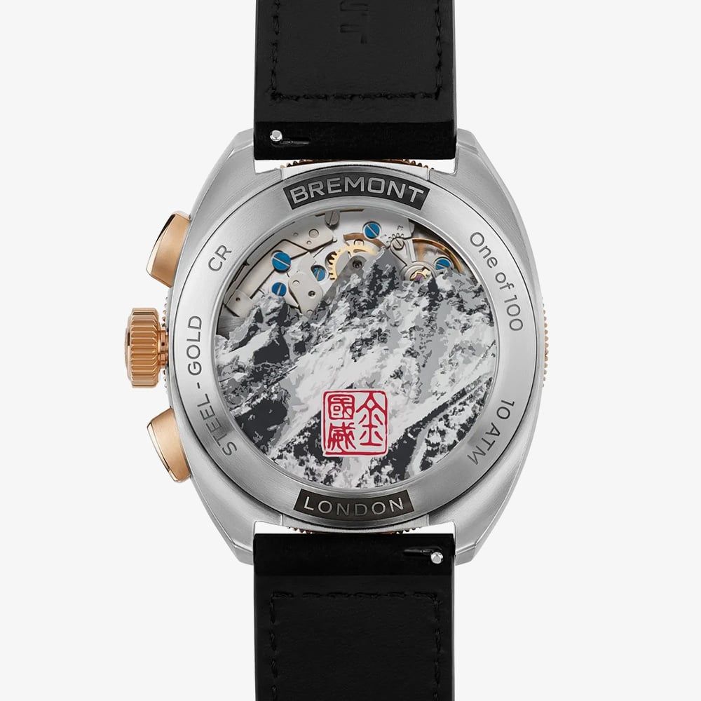 Engineered for those who push beyond the ordinary, the Bremont Terra Nova Jimmy Chin Chronograph combines rugged performance with refined detailing. The bold black dial is accented by rose gold luminous hands, ensuring clarity in all conditions. A black and rose gold bi-directional rotating bezel adds functional elegance, built for adventure. Turn the watch over to reveal a tribute to exploration: an engraved case back featuring the iconic Teton mountain range, honouring Jimmy Chin’s legendary expeditions. Chronometer-rated to the ISO 3159 standard, this timepiece guarantees exceptional accuracy, ready for every summit, story, and step of the journey.
