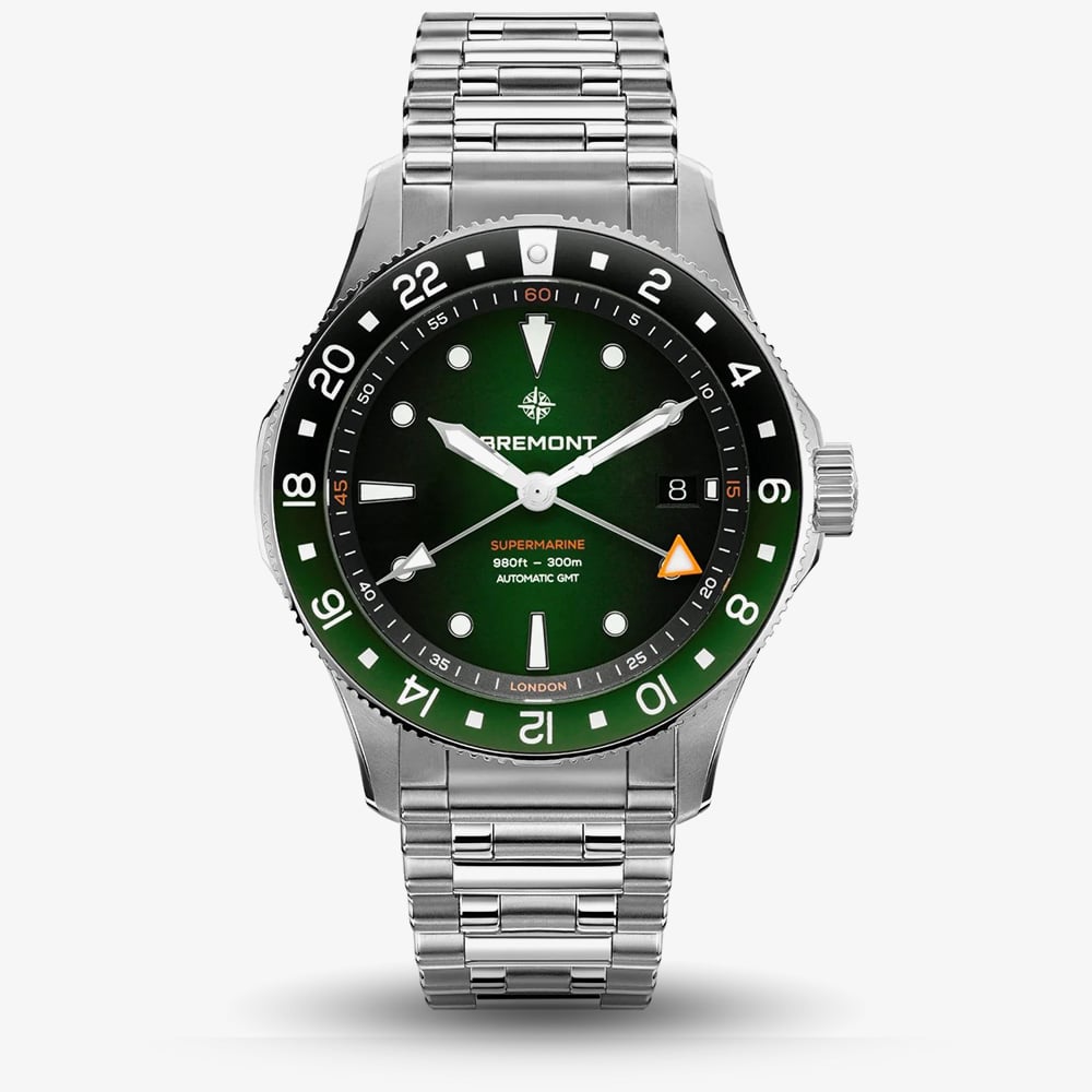 Built for adventure, the Tundra Green Supermarine GMT pairs rugged performance with bold design. Water-resistant to 300m, it features a green and black gradient dial, orange GMT accents, and a bi-directional 24-hour bezel. Super-LumiNova ensures visibility in any light, while the automatic movement offers a 50-hour power reserve.