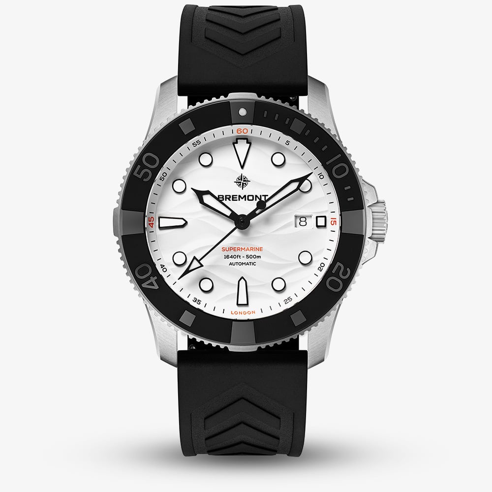 Ready for any adventure, the Bremont Supermarine 500m features tough 904L stainless steel and a sleek black ceramic bezel. Its eye-catching Polar White dial with a 3D wave pattern is enhanced by next-gen Super-LumiNova® for clear visibility underwater. Paired with a durable black rubber strap, this watch offers 500m water resistance, a helium escape valve, and a 56-hour power reserve, combining rugged performance with refined style.