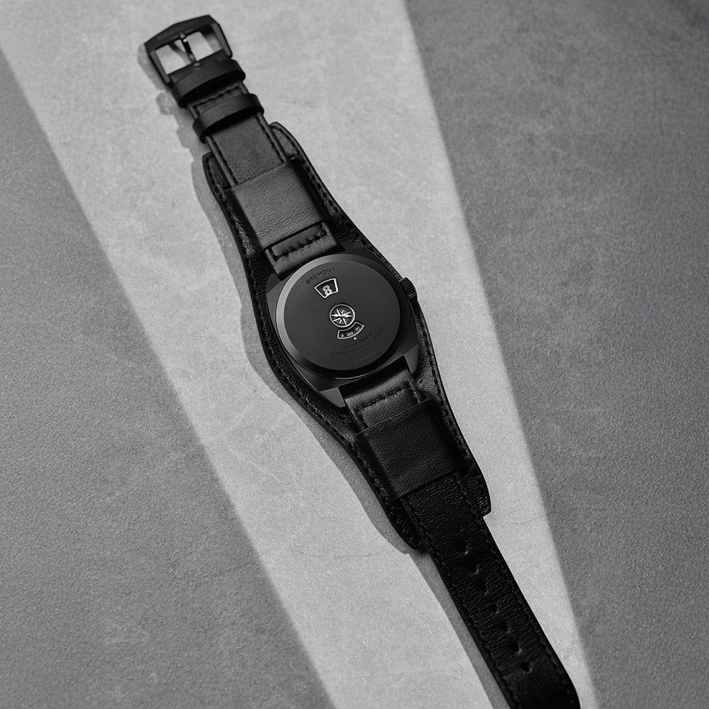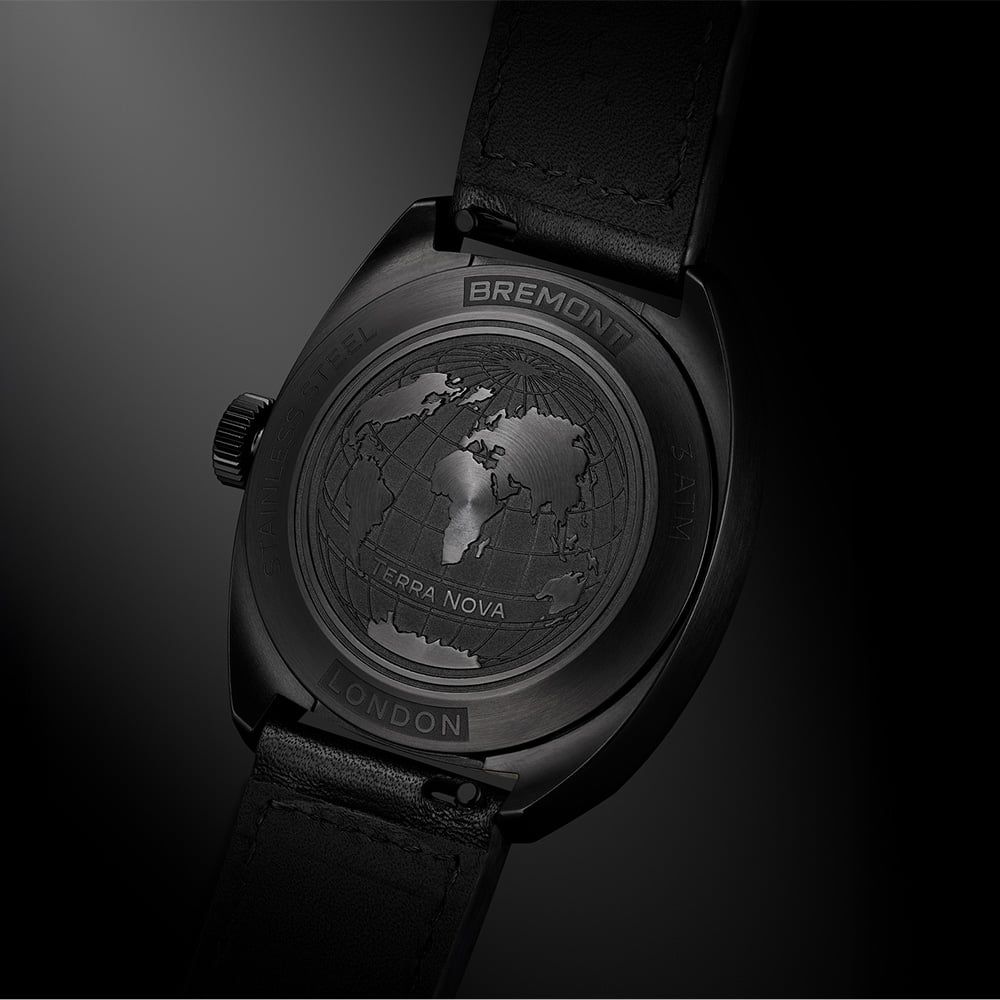 Drawing inspiration from the rugged utility of early 20th century trench watches, the Bremont Terra Nova 38 Jumping Hour arrives with a bold, contemporary edge. This award winning silhouette is reimagined in a striking monochrome aesthetic, featuring a 38mm cushion shaped case crafted from high grade 904L stainless steel. The exterior is coated in black diamond like carbon, a finish that provides an incredibly smooth, tactile quality while ensuring exceptional scratch resistance for the modern explorer. Its compact proportions and slim 9.1mm profile allow the watch to sit comfortably against the skin, making it an ideal companion for those who value a timepiece that balances a powerful presence with effortless, all day wearability.