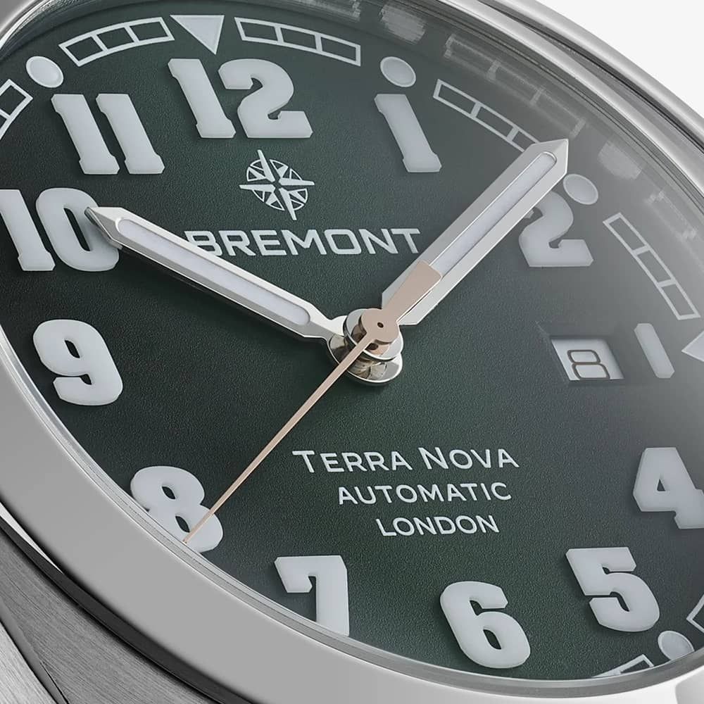 The Super-LumiNova® treatment extends to the indexes on the broken railroad minute track and vintage-inspired hands. The closed case back is engraved with a unique design, featuring a charted map of the world and the words ‘Terra Nova’. The crown is adorned with Bremont’s new logo, ‘The Wayfinder,’ emphasising the brand’s dedication to adventure and exploration.