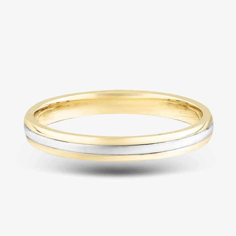 Crafted with precision and finesse, this exquisite ring features a classic design with a band of radiant 9ct two colour gold. Adding a touch of sophistication, the edges are 9ct yellow gold with a sleek stripe of 9ct white gold runs down the centre, creating a striking contrast and enhancing the ring's allure.