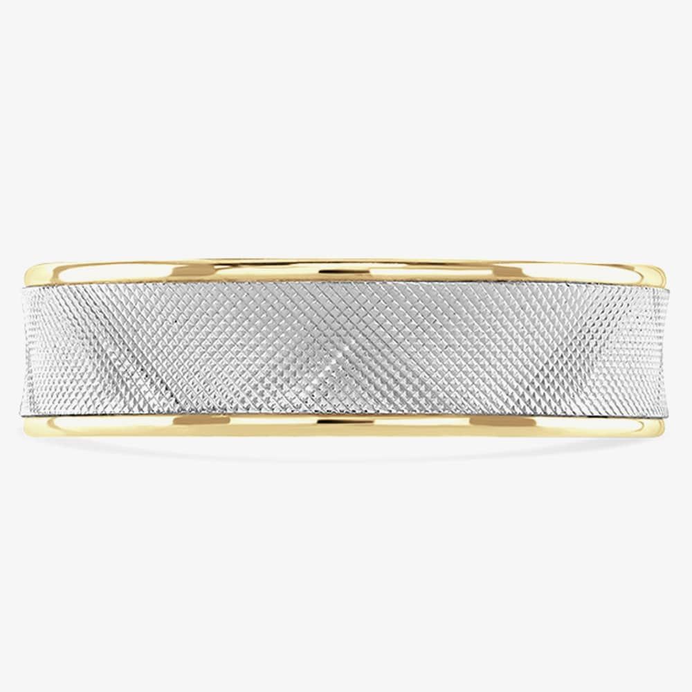 The Brown & Newirth Alloy Wedding Ring is delicately crafted from 18ct yellow gold with a contrasting 18ct white gold machined detailed centre band with rolled edges and presented in a medium gauge. The ring is a flat-top design, with the band measuring 5mm.