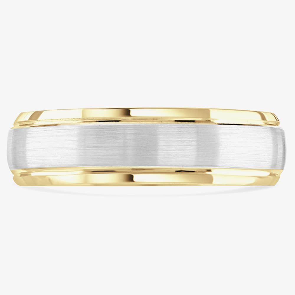 The Brown & Newirth Compliment Wedding Ring is delicately crafted from 18ct yellow gold with a contrasting 18ct white gold brushed centre band with defined bevelled edges and presented in a light gauge. The ring is a classic court design, with the band measuring 5mm.