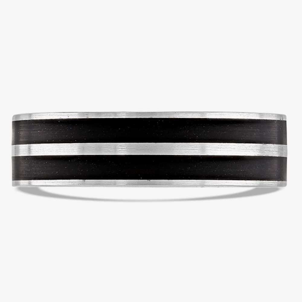 The Brown & Newirth Dalston Wedding Ring is delicately crafted from platinum with two black ceramic inlays in a brushed finish, with rolled edges, and presented in a medium gauge. The ring is a flat-top design, with the band measuring 5mm.