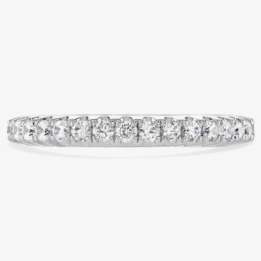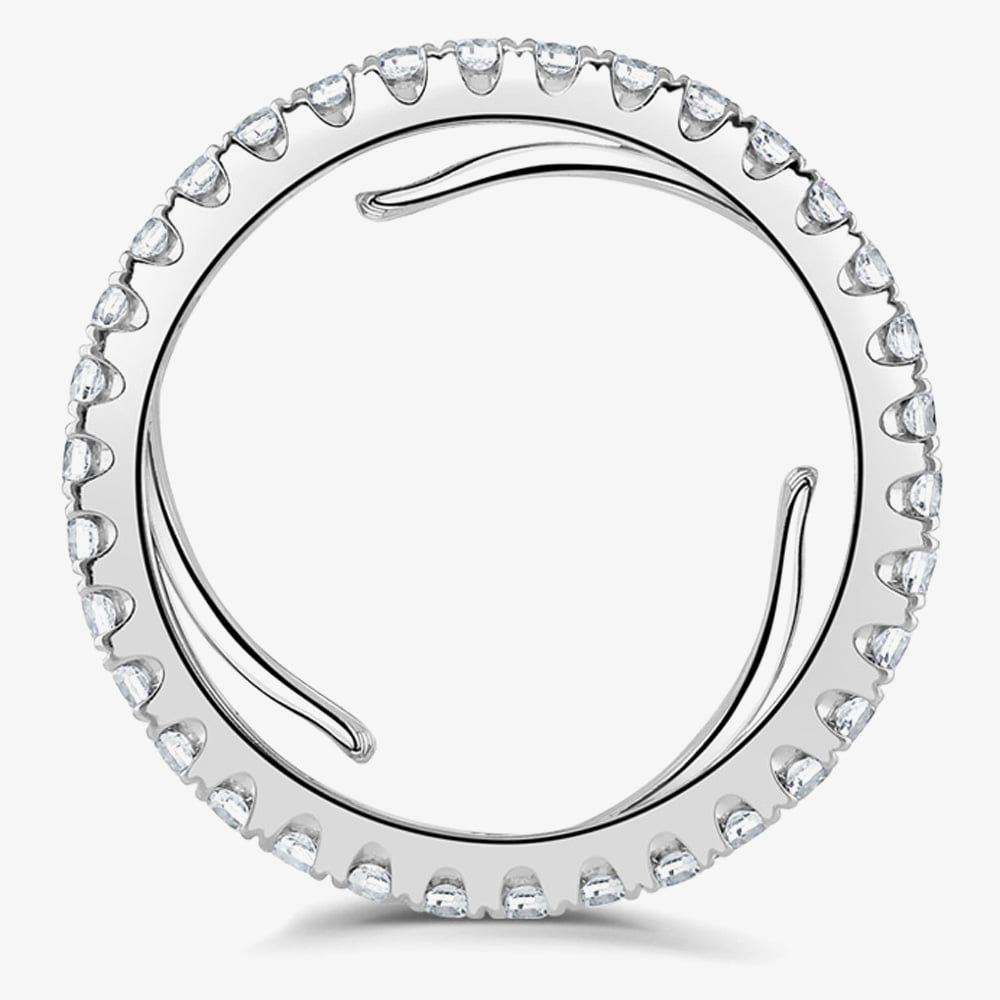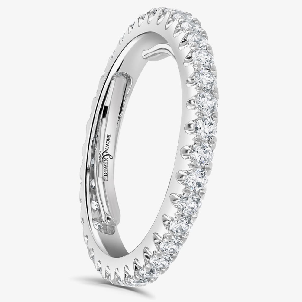From Brown & Newirth, this beautiful Evolution full eternity ring has been handcrafted in Platinum with 1.00ct of claw set brilliant cut diamonds which adorn the full hoop of this 3mm width band. Catching the light beautifully, these diamonds are ethically sourced & are H in colour with a SI in clarity. This eye-catching ring also features three ergonomic arms that are neatly tucked away through its lining and adapts with changes to your finger up to four sizes.