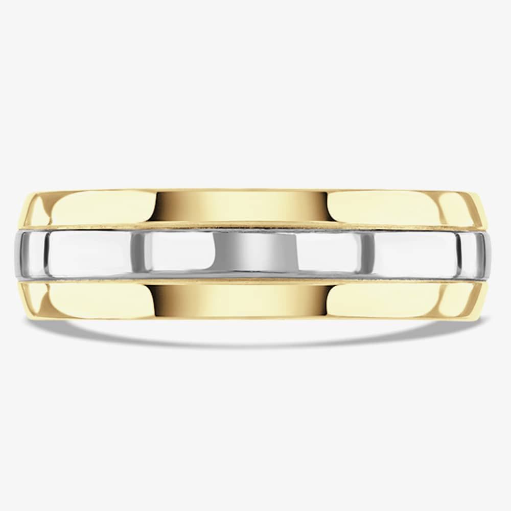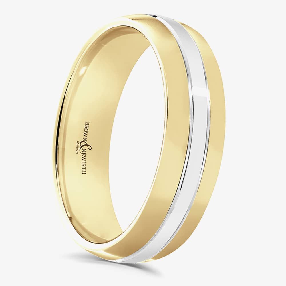 The Brown & Newirth Flux Wedding Ring is delicately crafted from 18ct yellow gold with a contrasting 18ct white gold centre band, defined by v-cuts, and presented in a light gauge. The ring is a classic court design, with the band measuring 5mm.