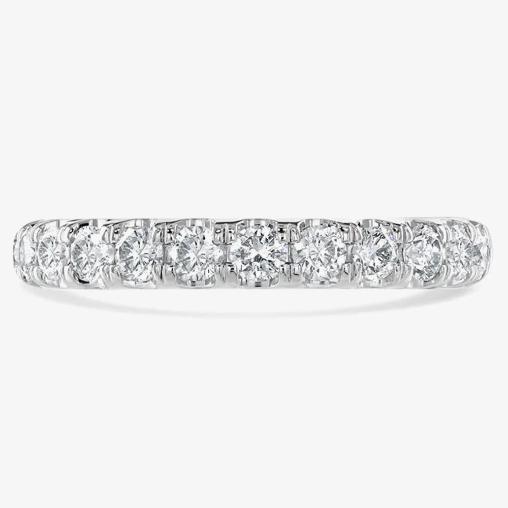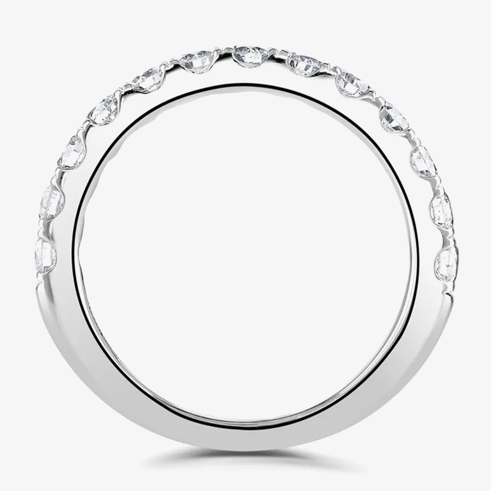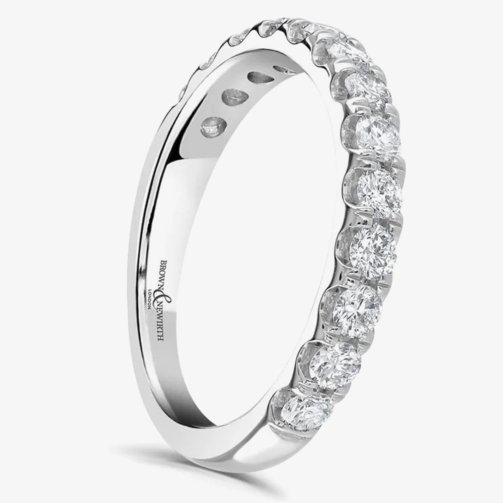 Exquisitely crafted in platinum, this half eternity ring is a sight to behold. A row of 0.75ct brilliant cut white diamonds are stunningly set in a four-claw setting around half of the band, captivating all who see it. This classic court half eternity ring is a symbol of everlasting love and commitment, and is sure to turn heads wherever you go.