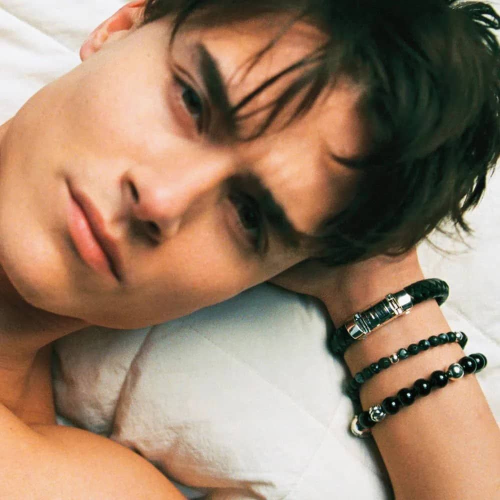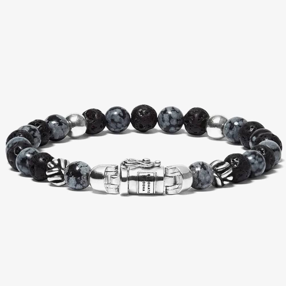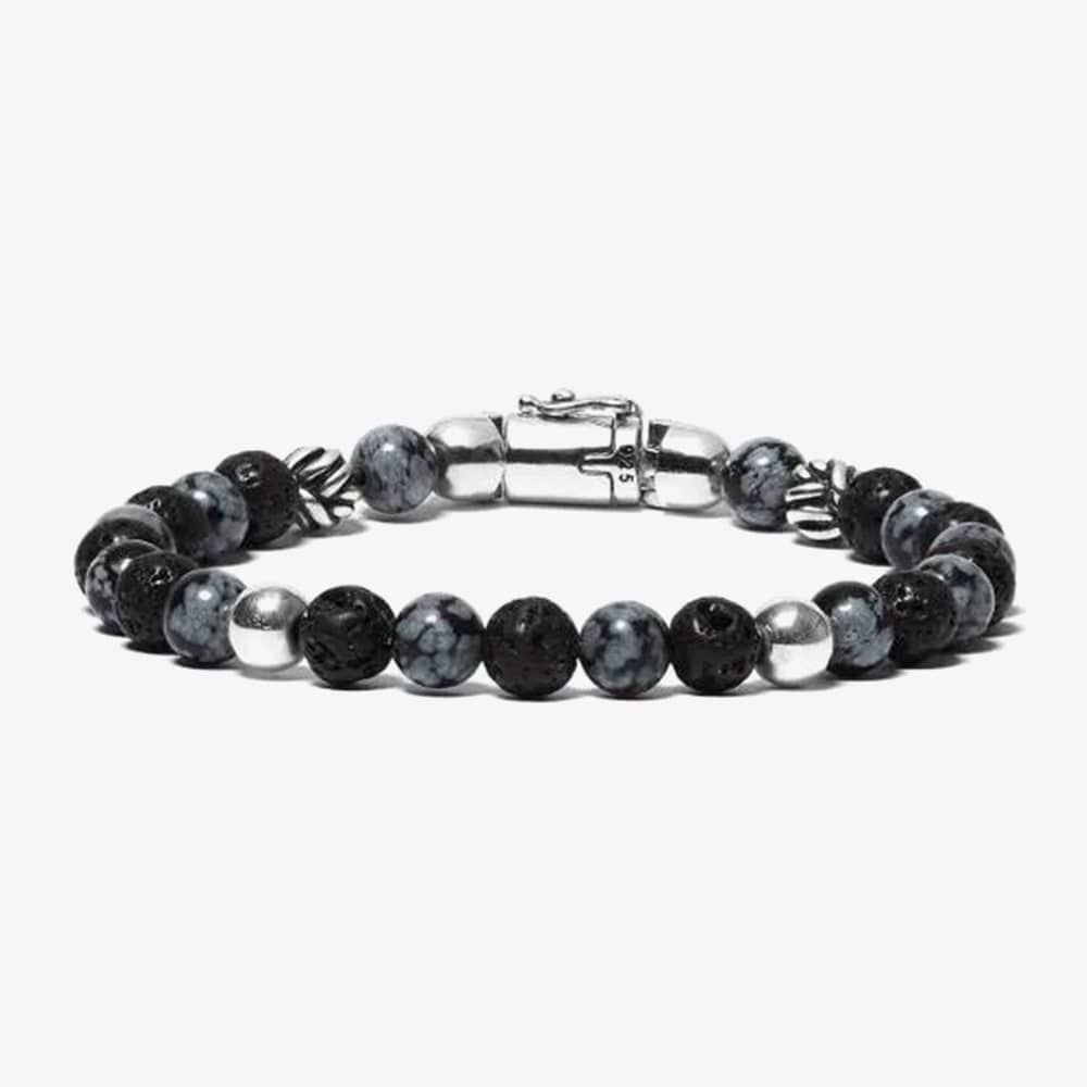 This handmade, timeless bracelet is inspired by prayer beads and features an iconic sterling silver lock. The black lava stones and snowflake obsidian stones are said to bring balance to body, mind, and spirit, and to calm the emotions. The bracelet is easy to combine with leather or silver pieces, but please note that the lock contains a magnet, which is not stainless steel. Therefore, it is important to avoid contact with water to prevent rust.