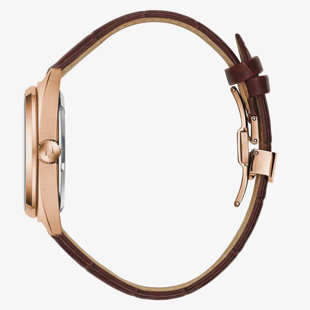 Bulova Classic Rose Gold Tone Skeleton Brown Leather Strap Watch 97A175
