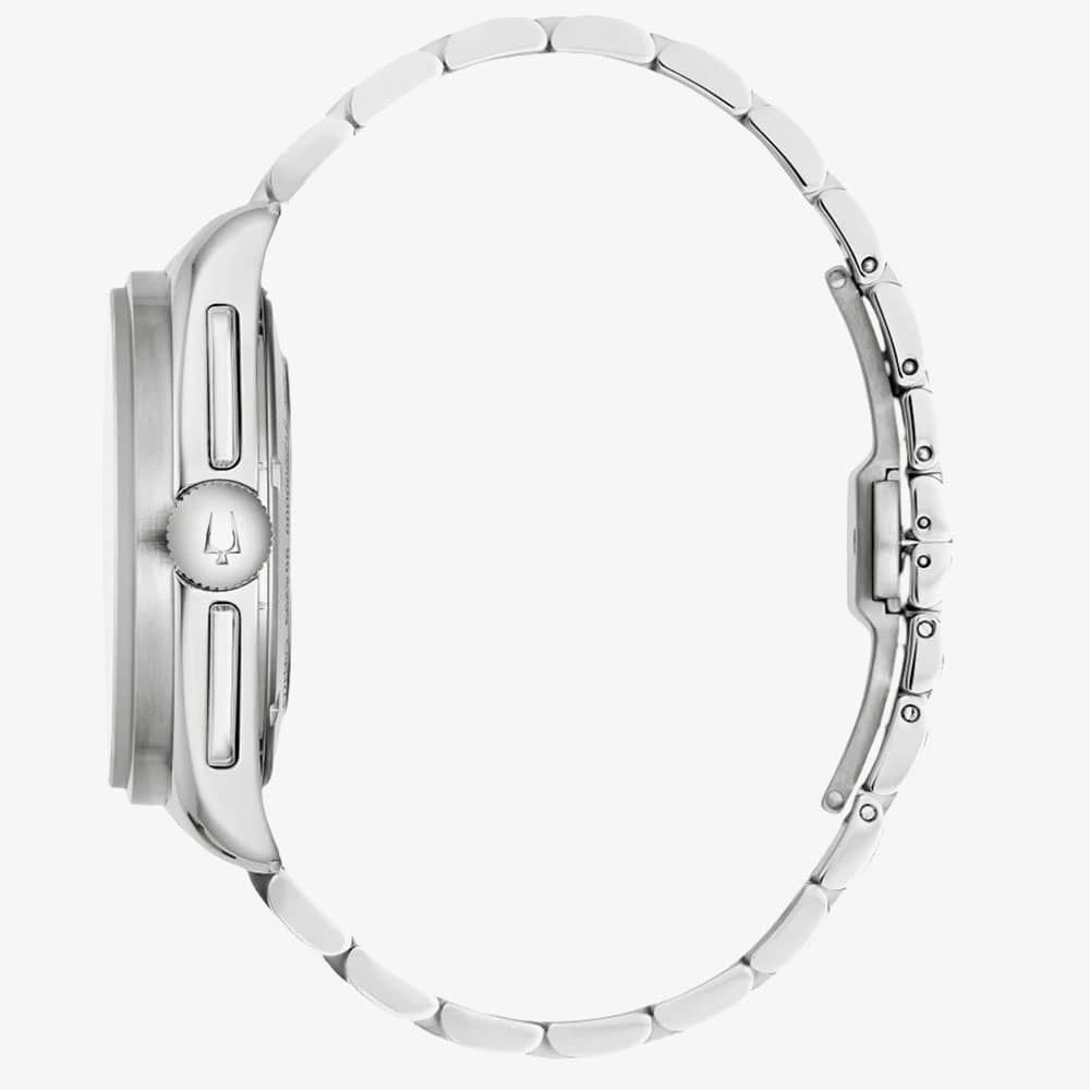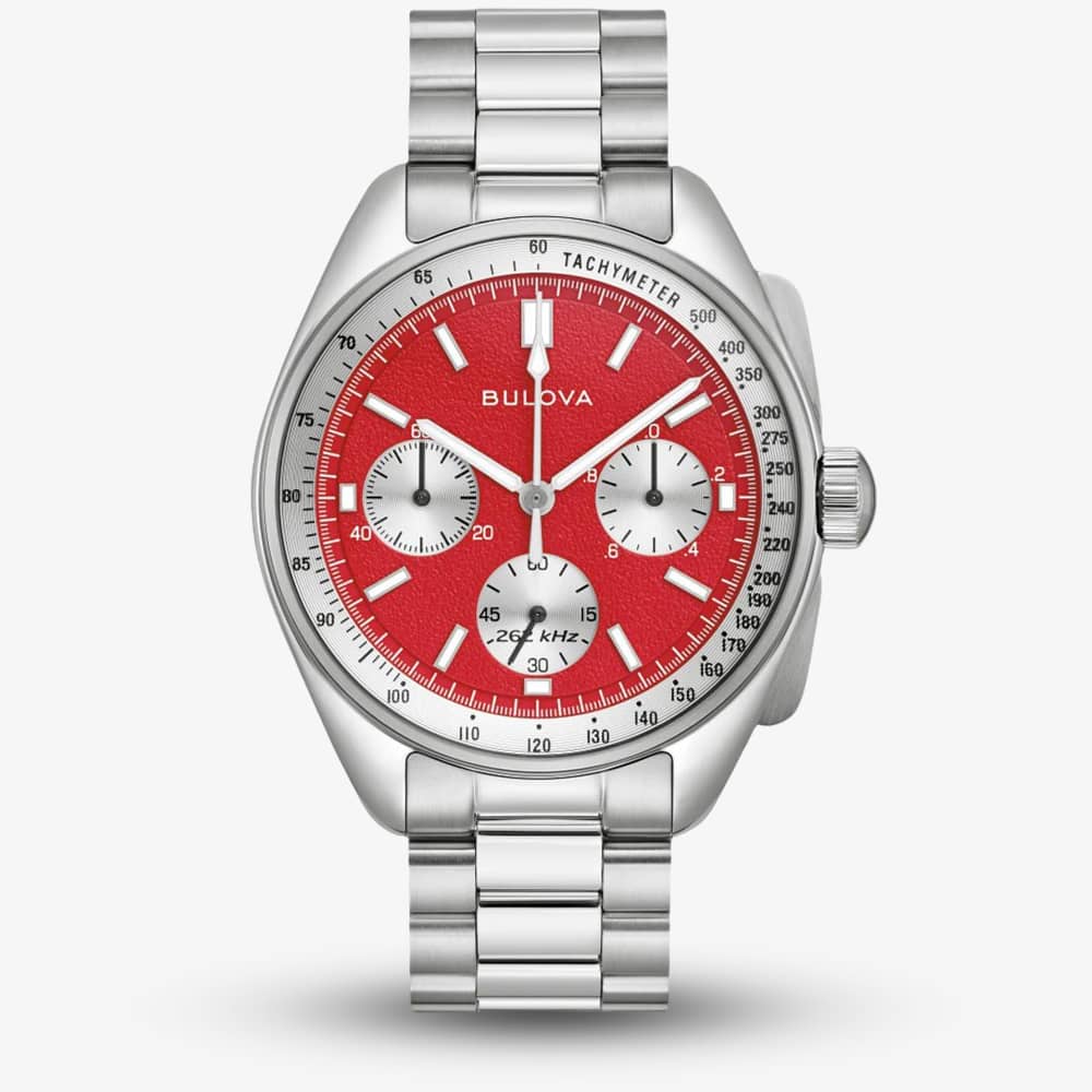 The Lunar Pilot chronograph is an ideal watch for the modern adventurer, elegantly showcasing a distinctive red and silver panda style chronograph. Its striking red dial, inspired by the 'blood moon,' contrasts beautifully with the silver-white tachymeter adorned with the Bulova tuning fork logo. This timepiece is mounted on a stainless-steel bracelet with a secure push-button deployment clasp and merges historical space exploration design with contemporary style.