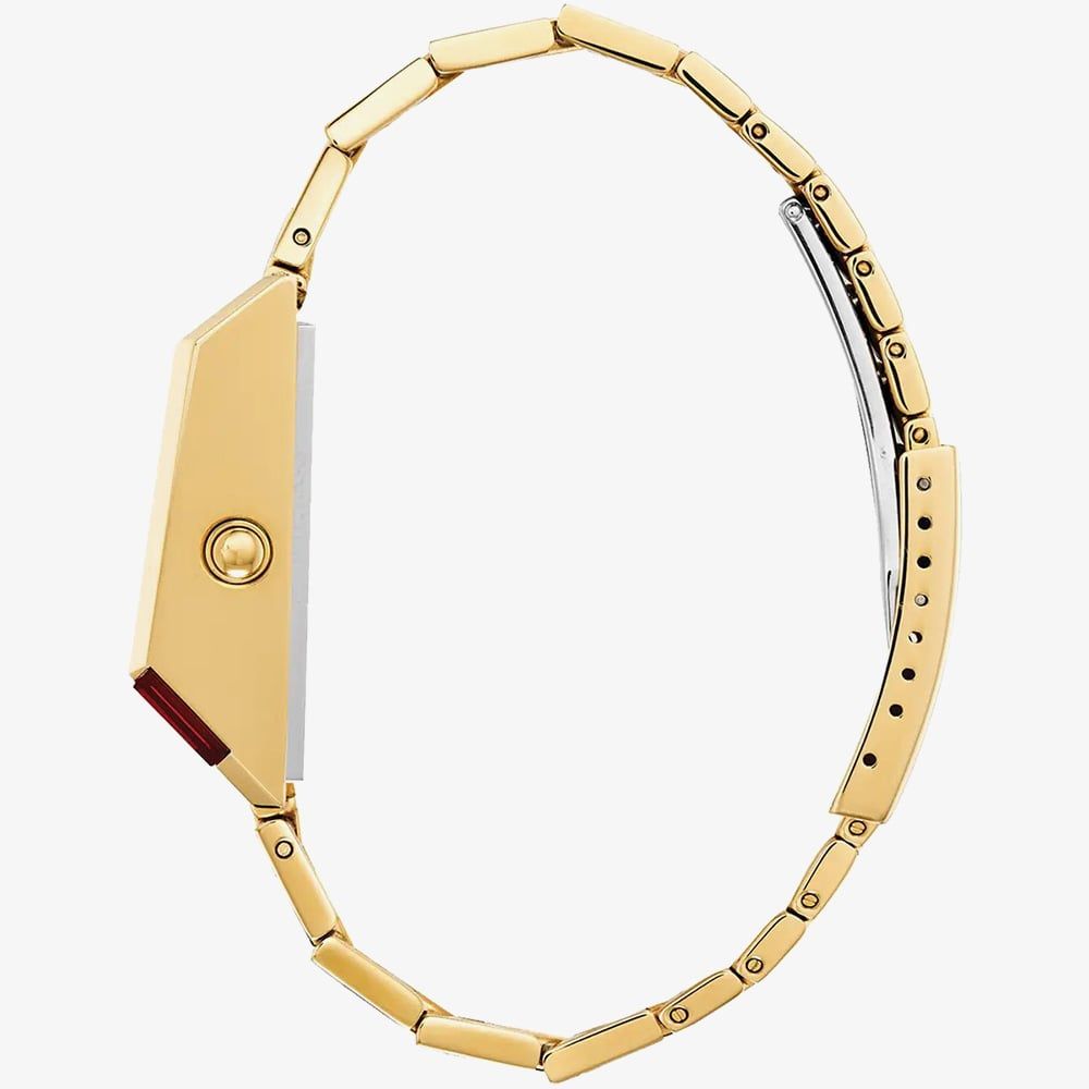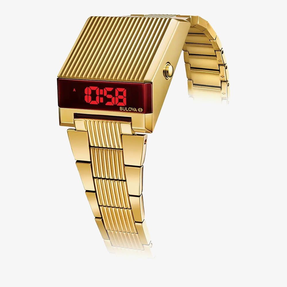 The Bulova Archive Series blends iconic vintage designs with modern features, continuing with the digital LED Computron. This sleek gold-tone stainless steel watch boasts a red LED display, expanded digital functionality with dual time zone capabilities, and a retro look that remains stylish today, just as it did in the 1970s. It is water-resistant up to 30 meters.
