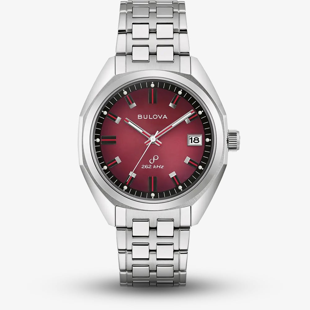 The Bulova 1973 Jet Star “F” combines iconic 1970s design with modern precision. Featuring a stainless-steel case, angular design, and domed sapphire crystal, it has a merlot dial with silver-tone hands and luminescent markers. Powered by Bulova’s 262kHz Precisionist movement, it offers unmatched accuracy, a sweeping seconds hand, and is resistant to temperature changes. The watch is finished with a stainless-steel bracelet, blending legendary style with modern performance.