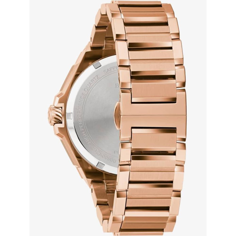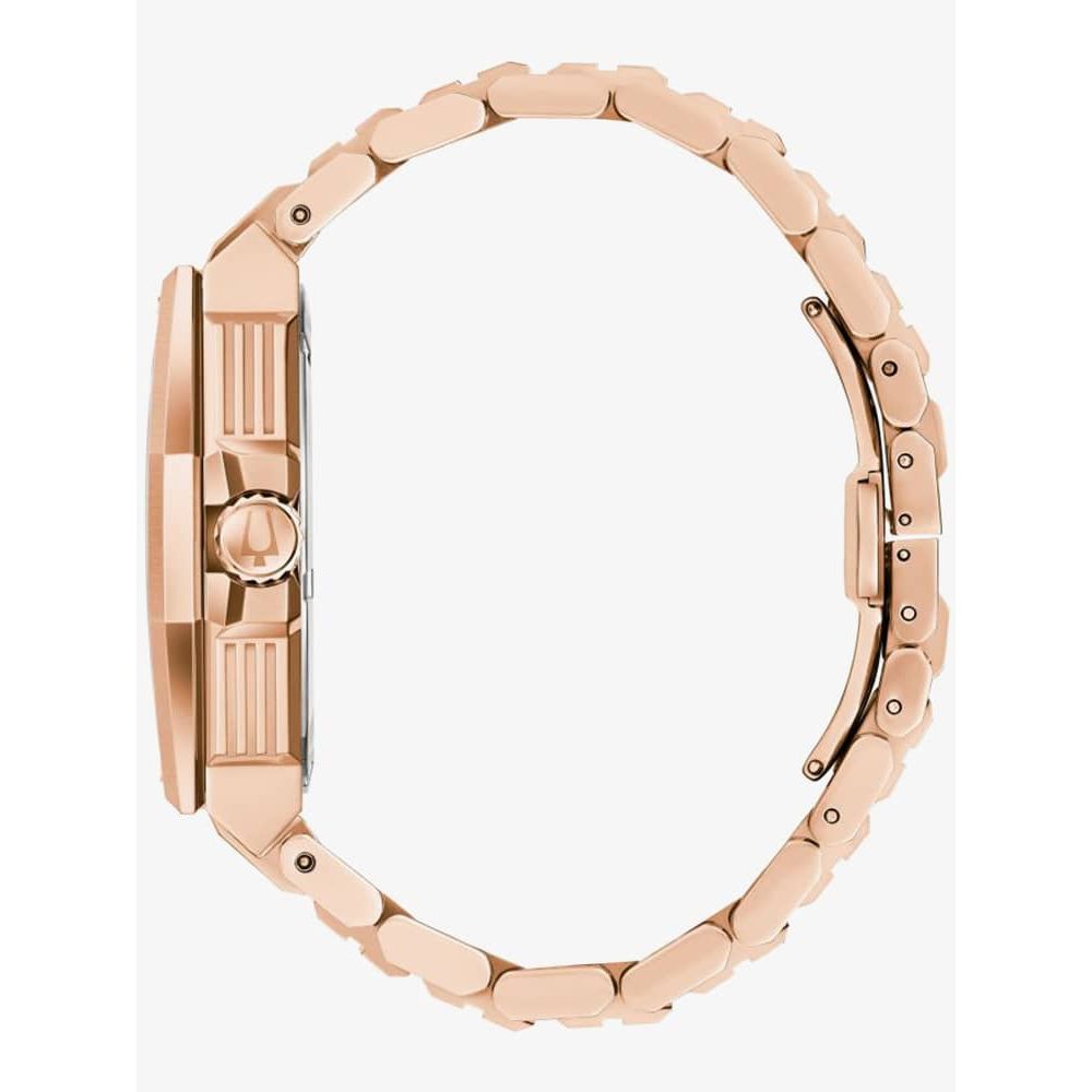 The Bulova 97D129 watch combines a 47mm round shaped stainless steel case and rose gold stainless steel bracelet. It has a black analogue dial with date display which is protected beneath mineral crystal glass. Power is generated by the quartz movement. This model also has a water resistance of up to 100 metres.