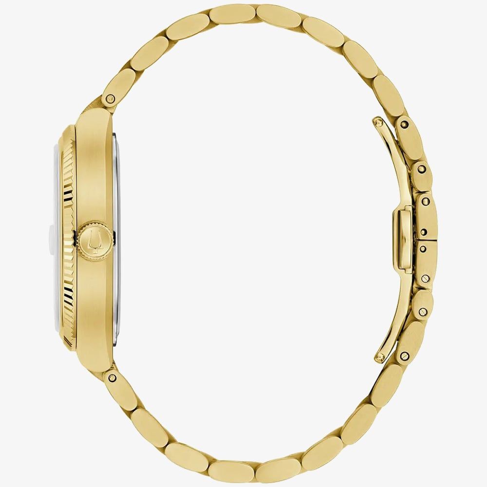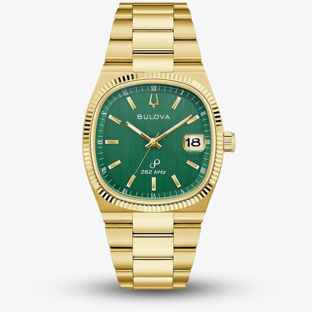 Inspired by the iconic 1970s original, the new Super Seville blends bold retro design with cutting-edge Precisionist technology. Its gold-tone 38mm TV-shaped case and integrated bracelet deliver standout style, while the green vertically brushed dial, coin edge bezel, and date magnifier add refined detail. Powered by Bulova’s ultra-accurate quartz movement with a smooth sweeping second hand, this is timeless elegance with modern performance.