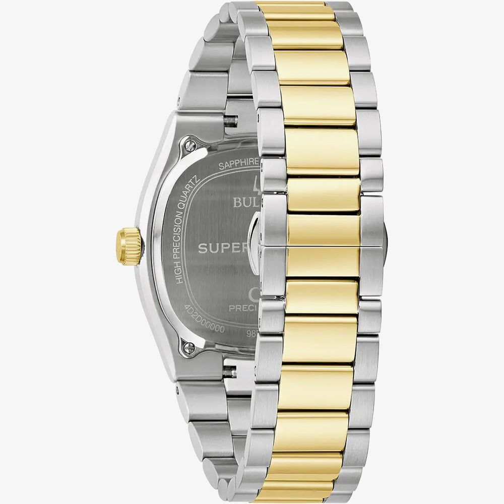 A striking fusion of 1970s flair and today’s technology, the two-tone Super Seville makes a statement with its bold 38mm TV-shaped case, integrated bracelet, and rich blue brushed dial. Gold-tone hands, a coin edge bezel, and date magnifier complete the vintage-inspired look. Powered by Bulova’s Precisionist movement for ultra-accurate timekeeping and a smooth sweep second hand, this is classic style redefined for the modern man.